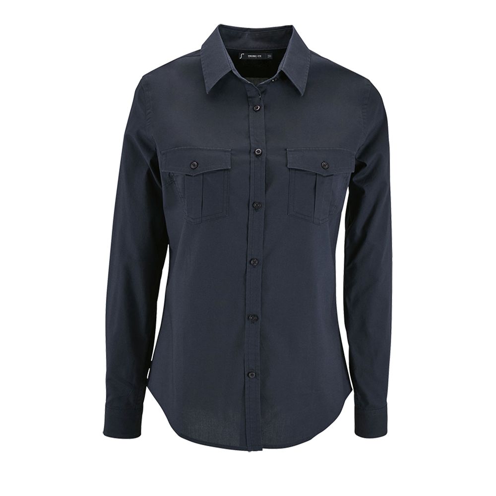 Рубашка приталенного кроя в стиле «сафари» с планкой на 7 пуговиц в тон. Манжеты с 1 пуговицей, накладные карманы с клапанами на пуговицах на груди. Горизонтальные и вертикальные вытачки для комфортной посадки. Длина рукава регулируется.