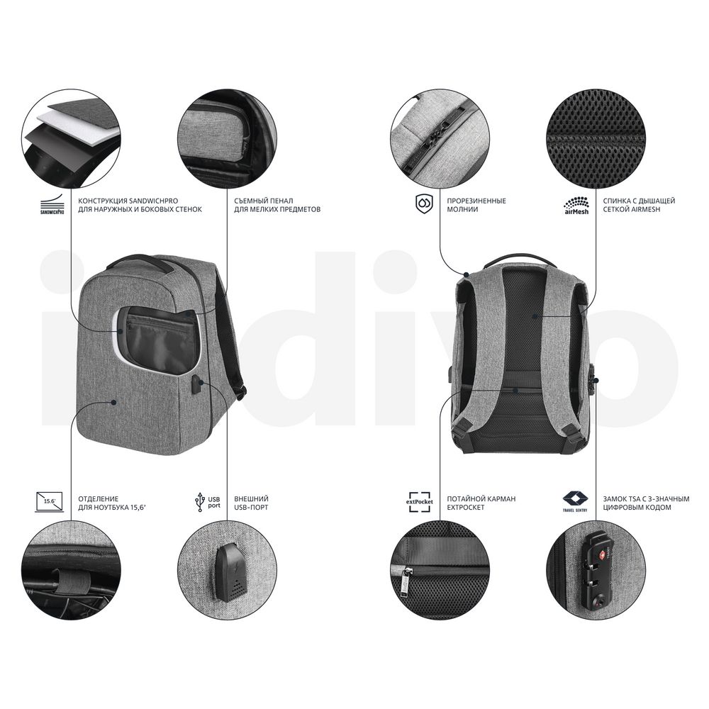 В конструкции InGreed все продумано до мелочей: ценное содержимое рюкзака всегда будет под надежной защитой, ведь за это отвечают сразу несколько специальных разработок. Конструкция наружных и боковых стенок рюкзака под названием sandwichPro состоит из четырех слоев: верхний Waterproof TEX не пропускает влагу, а остальные спасут от порезов. Смещенная к спинке молния центрального отделения осложняет нежелательный доступ к содержимому, а дополнительную безопасность гарантирует замок TSA с трехзначным цифровым кодом.