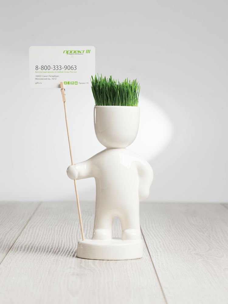 В комплекте деревянная палочка с зажимом, где можно разместить фотографию, открытку, визитку или записку с напоминанием.Изготавливается вручную из глины без искусственных примесей. В комплекте фигурка, грунт, семена теневыносливой газонной травы и инструкция для посадки.