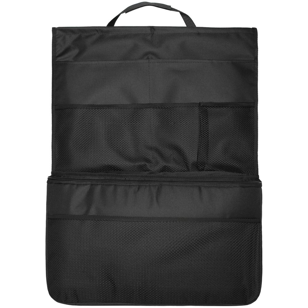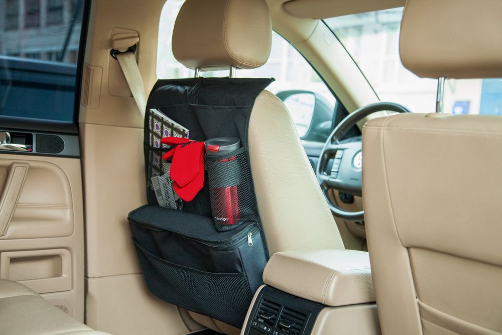 Органайзер защищает спинку сидения от загрязнений и позволяет компактно разложить все необходимые вещи. Найдется место для журналов, ручек и карандашей, очков, гаджетов, бутылки с водой и других необходимых в дороге мелочей. Вместительное термоотделение сохранит напитки или йогурты холодными, а бутерброды — горячими.Органайзер крепится за подголовник с помощью петли на липучке и фиксируется на спинке сиденья резинкой. Жесткие вставки не позволяют верхним углам провисать.