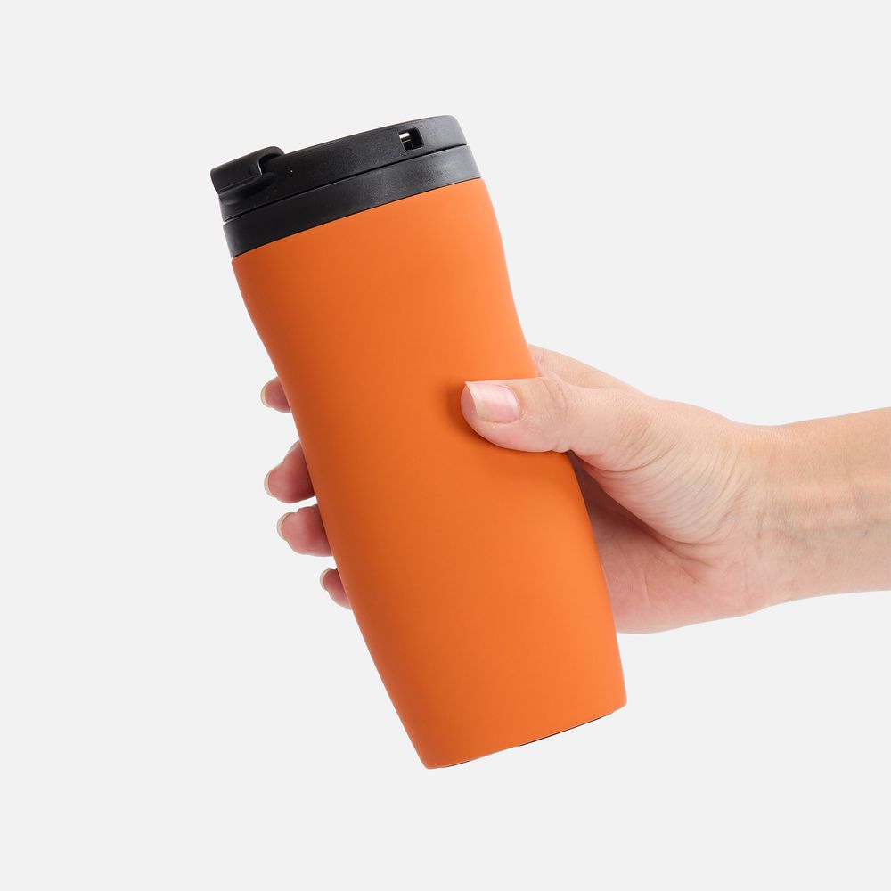 Двухслойная конструкция из нержавеющей стали снаружи и пищевого пластика внутри. Герметичная завинчивающаяся крышка с откидным клапаном для питья. Покрытие софт-тач. В отверстие в крышке можно вставить шнурок для удобного ношения стакана на руке. Шнурок в комплект не входит.