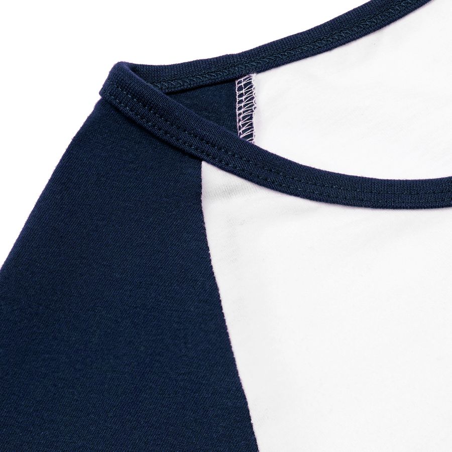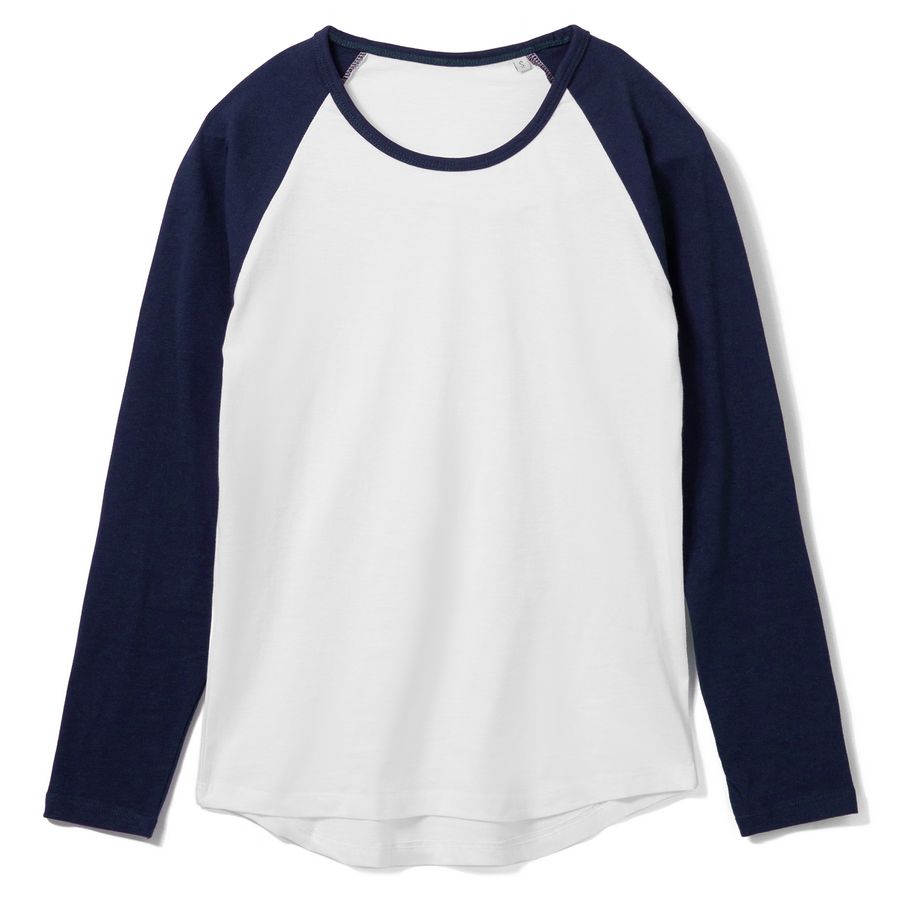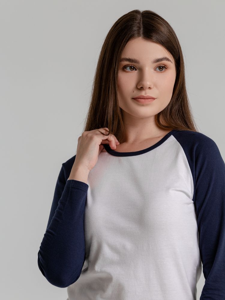 Женская двухцветная футболка с боковыми швами, длинным рукавом реглан и закругленным низом.