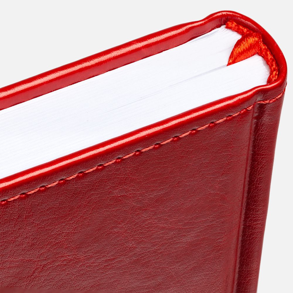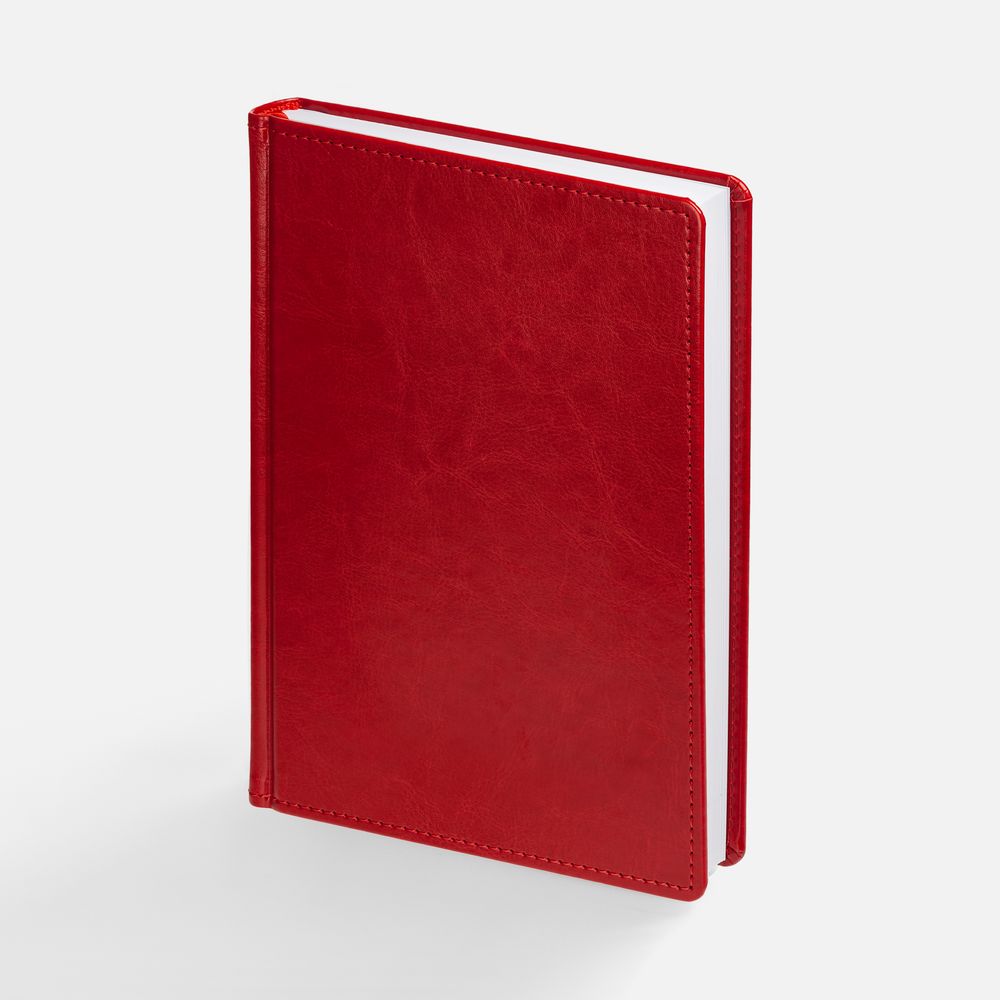 Ежедневник с твердой обложкой без поролона, выполнен из материала Nebraska, красный PP, дополнен ляссе и капталом в цвет обложки.