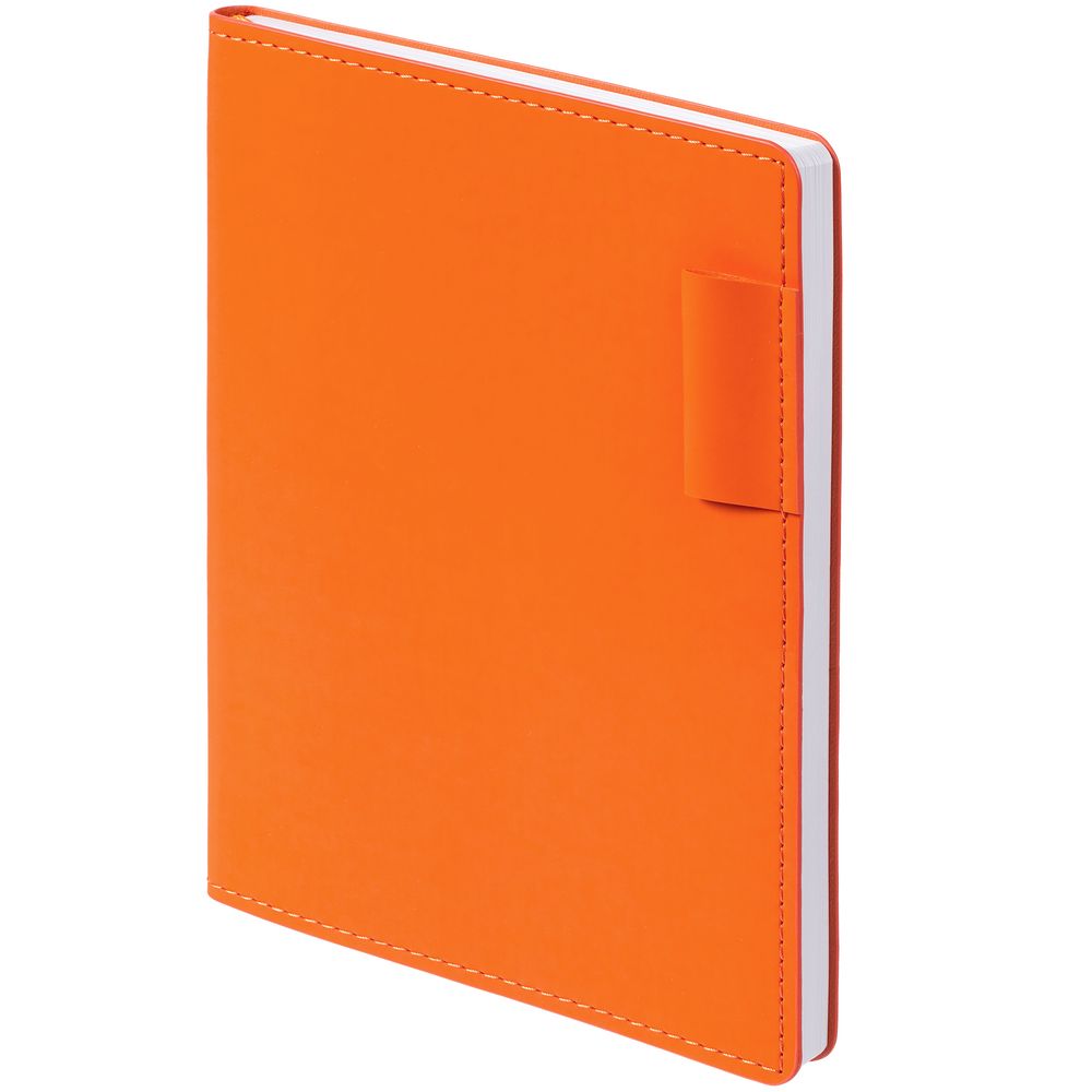 Ежедневник с гибкой обложкой из материала Soft Touch, оранжевый ОО и Latte, оранжевый ОО (внутренний материал), дополнен петелькой для ручки из покровного материала, капталом, ляссе и закрашенным срезом обложки в цвет материала.
