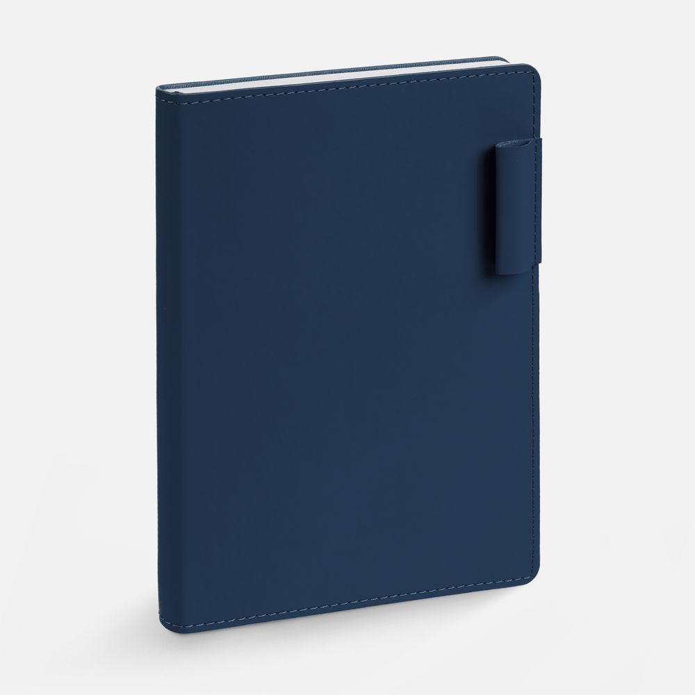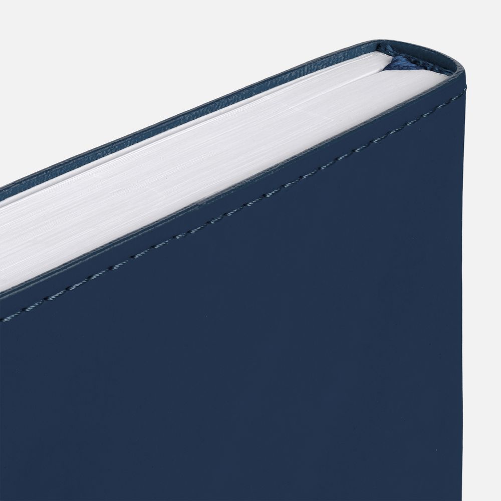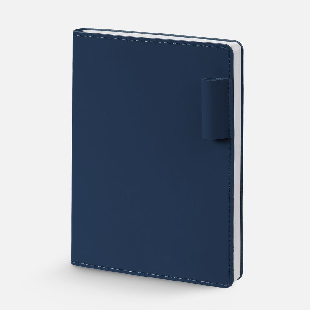 Ежедневник с гибкой обложкой из материала Soft Touch, синий НН и Latte, темно-синий (внутренний материал), дополнен петелькой для ручки из покровного материала, капталом, ляссе и закрашенным срезом обложки в цвет материала.