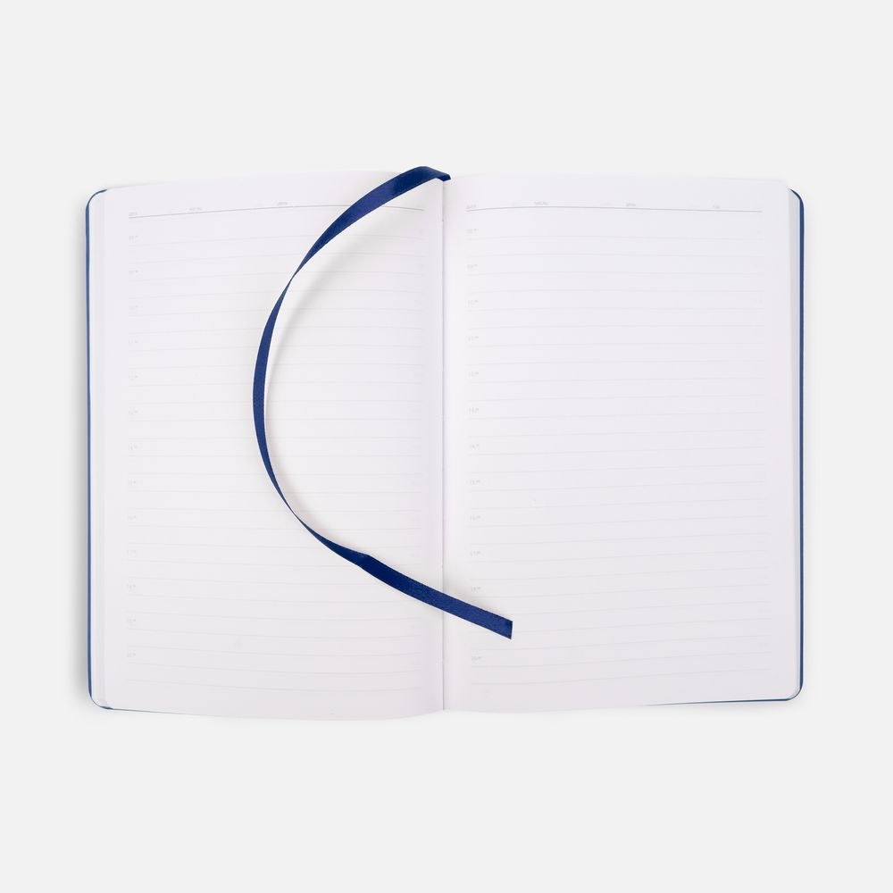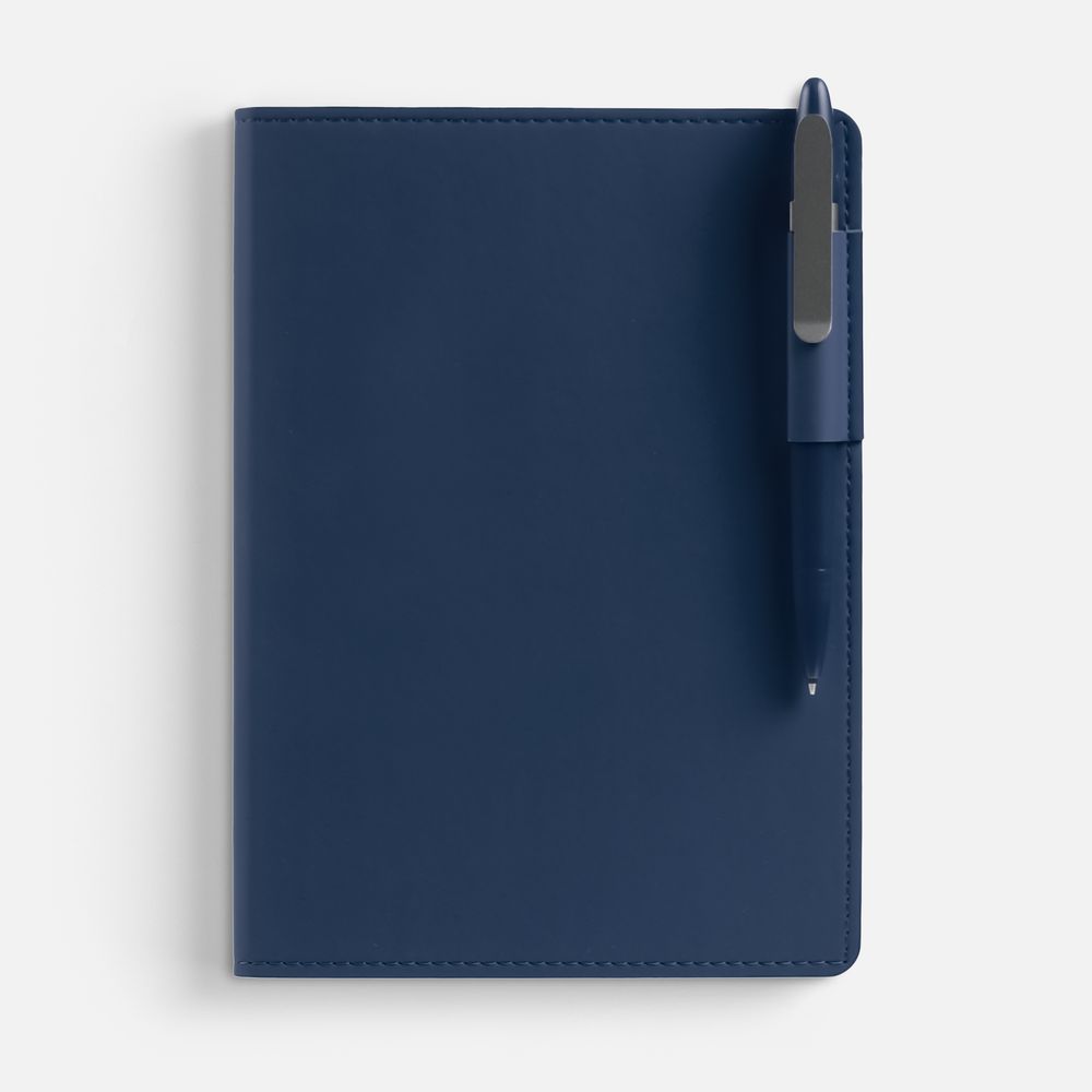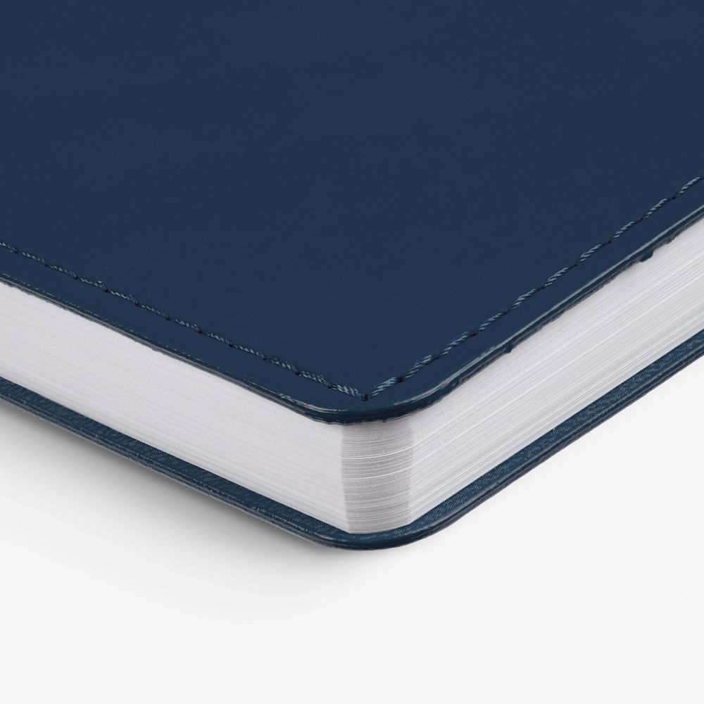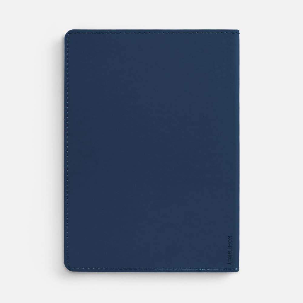 Ежедневник с гибкой обложкой из материала Soft Touch, синий НН и Latte, темно-синий (внутренний материал), дополнен петелькой для ручки из покровного материала, капталом, ляссе и закрашенным срезом обложки в цвет материала.