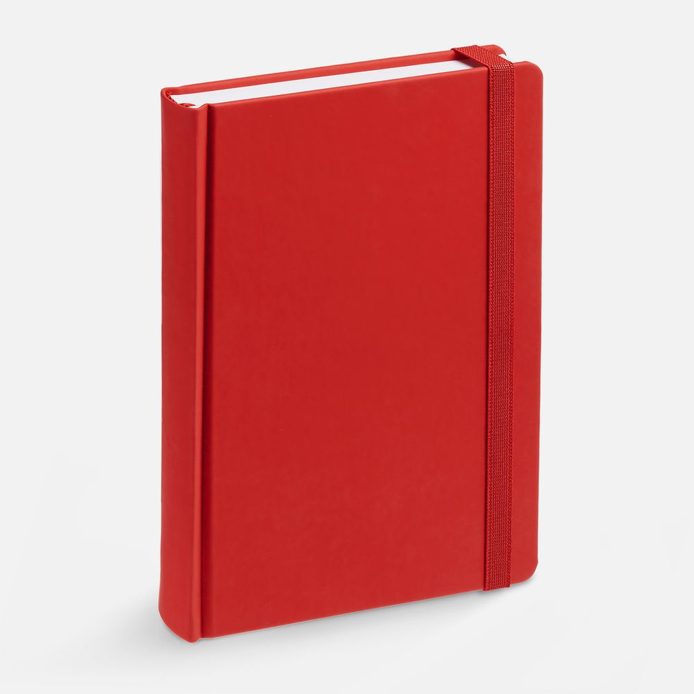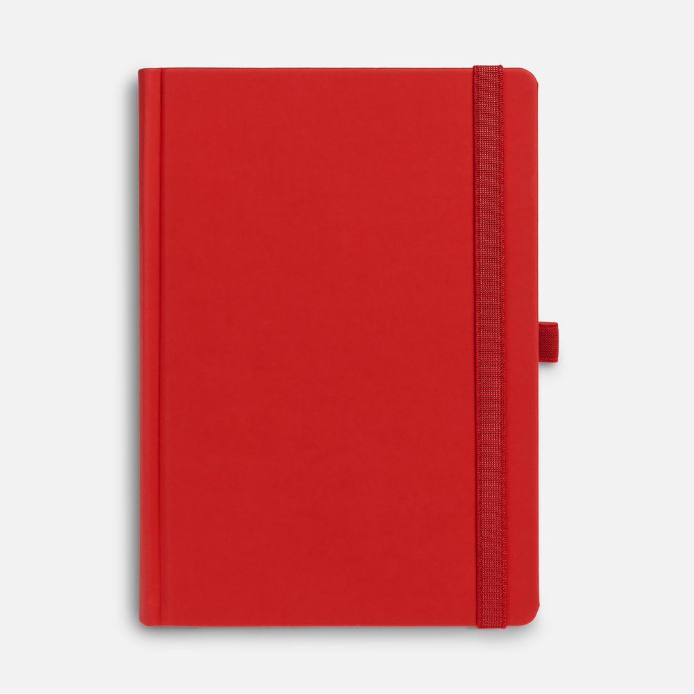 Ежедневник с твердой обложкой без поролона, выполнен из материала Soft Touch Ultra, красный РР, дополнен резинкой шириной 1 см, петлей-резинкой для ручки, капталом и ляссе красного цвета.