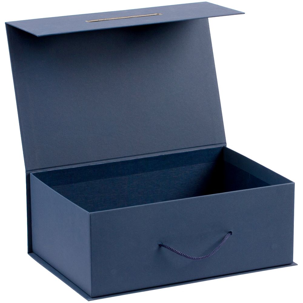 Коробка выполнена из переплетного картона, кашированного дизайнерской бумагой Malmero «Благородный синий», с крышкой на магните. Выдерживает вес до 1,5 кг. Для большей нагрузки рекомендуется провести тест самостоятельно.