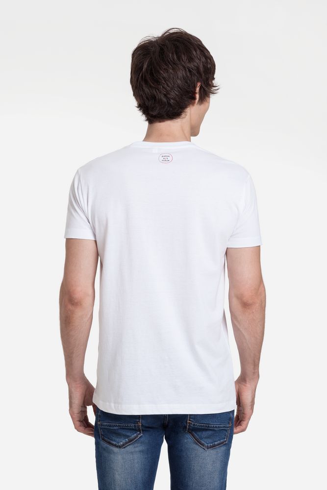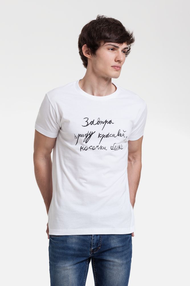 Кроеная футболка (с боковыми швами). Приталенная облегающая модель, зауженный книзу рукав, укрепляющая тесьма по вороту, воротник связан резинкой с эластаном. Лейбл производителя в боковом шве изнутри, в шве горловины — только бирка с размером.
