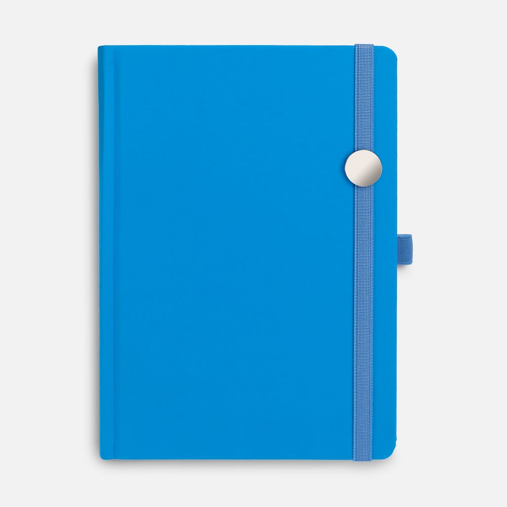 Ежедневник с твердой обложкой без поролона, выполнен из материала Soft Touch Ultra, голубой JJ, дополнен резинкой шириной 1 см, петлей-резинкой для ручки, капталом и ляссе голубого цвета.
