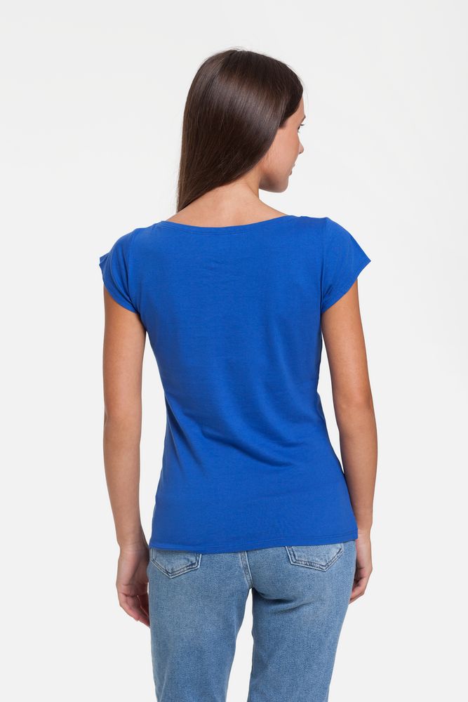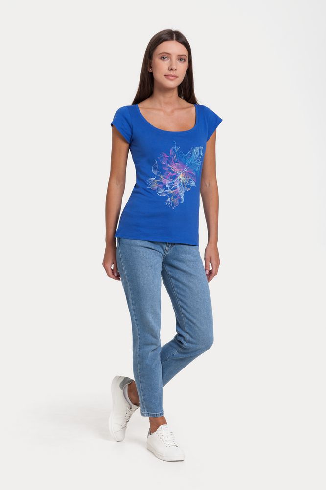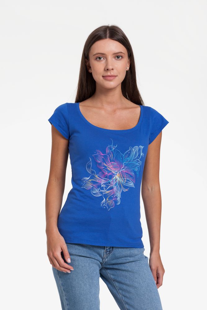 Коллекция Vibrance: для тех, кто живет прислушиваясь к зову своего сердца и чувствует бит окружающего мира.Футболка женственного приталенного силуэта с американской проймой и глубоким вырезом, отделанным обтачкой из джерси. Двойная прострочка на вороте спереди, на рукавах и по низу.