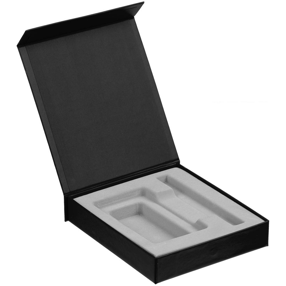 Подарочная коробка для аккумулятора 12,3х7,1х1 см и ручки 14,5х1,5х0,8 см с крышкой на магните и флокированным ложементом. Коробка выполнена из переплетного картона, кашированного дизайнерской софт-тач бумагой Senzo.