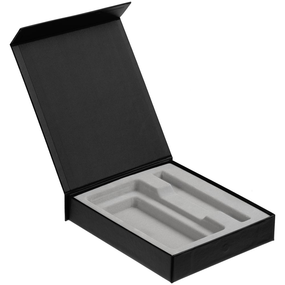 Подарочная коробка для аккумулятора 14,6х7,5х1,3 см и ручки 14,5х1,5х0,8 см с крышкой на магните и флокированным ложементом. Коробка выполнена из переплетного картона, кашированного дизайнерской софт тач бумагой Senzo.