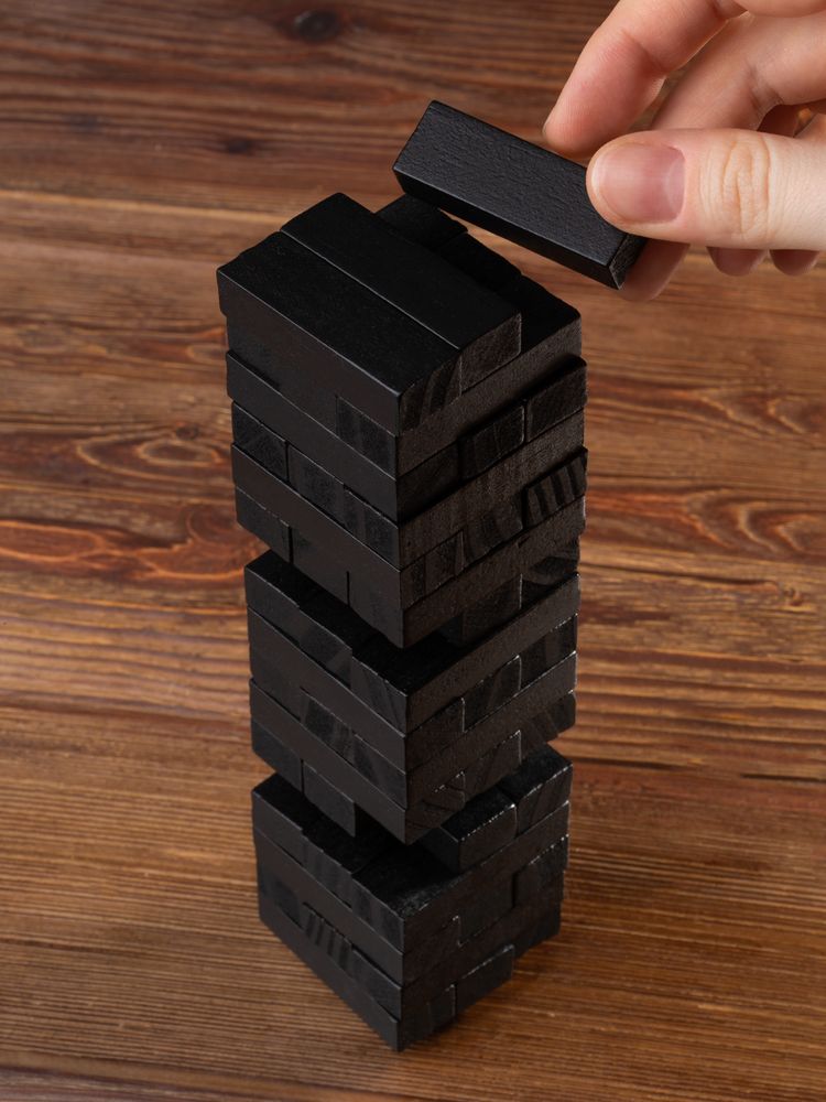 Второе название игры — «Падающая башня». Сначала строится башня: по три брусочка в ряд, каждый слой перпендикулярен предыдущему. Затем игроки по очереди вытаскивают по одному брусочку и кладут его на верх сооружения. Тот игрок, кто обрушит башню, проиграл. Игра тренирует ловкость, внимание, терпение и пространственное мышление, что очень важно и в бизнесе. Так что подарок не только развлечет, но и может стать символом-пожеланием. Игра состоит из 48 деревянных брусочков. Поставляется в картонной коробке. Инструкция с правилами в комплекте.