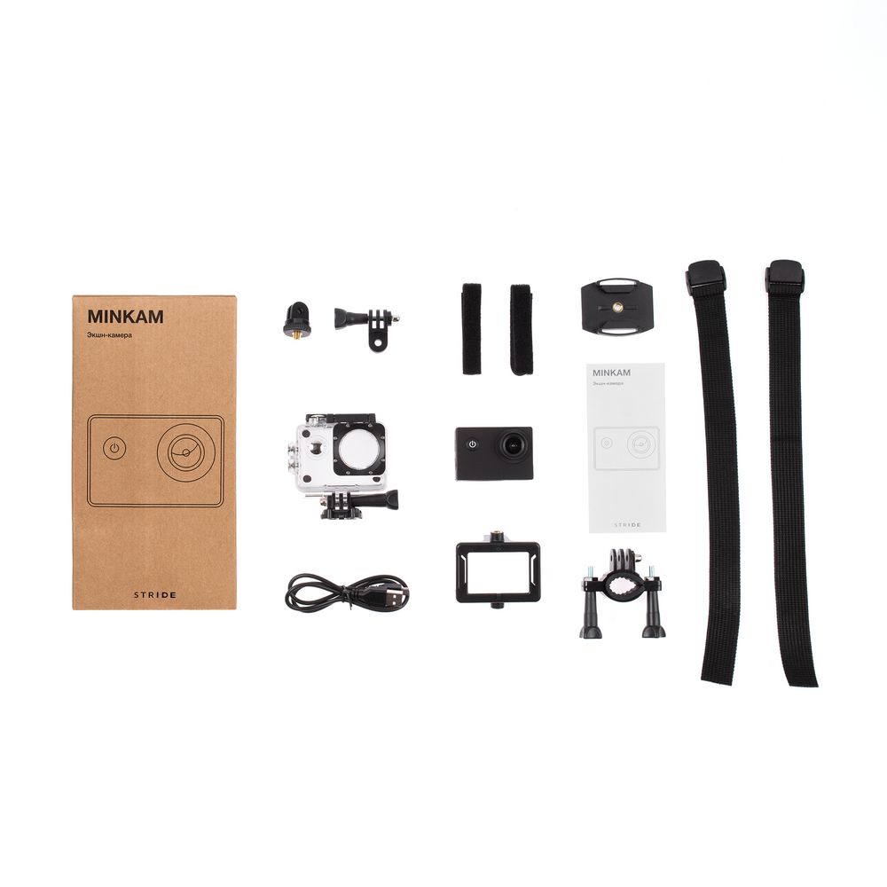 Благодаря многофункциональному набору аксессуаров с Minkam можно работать в любых условиях. В комплекте — бокс для подводной съемки, крепление на шлем, крепление на руль велосипеда или самоката, рамка и ремни.