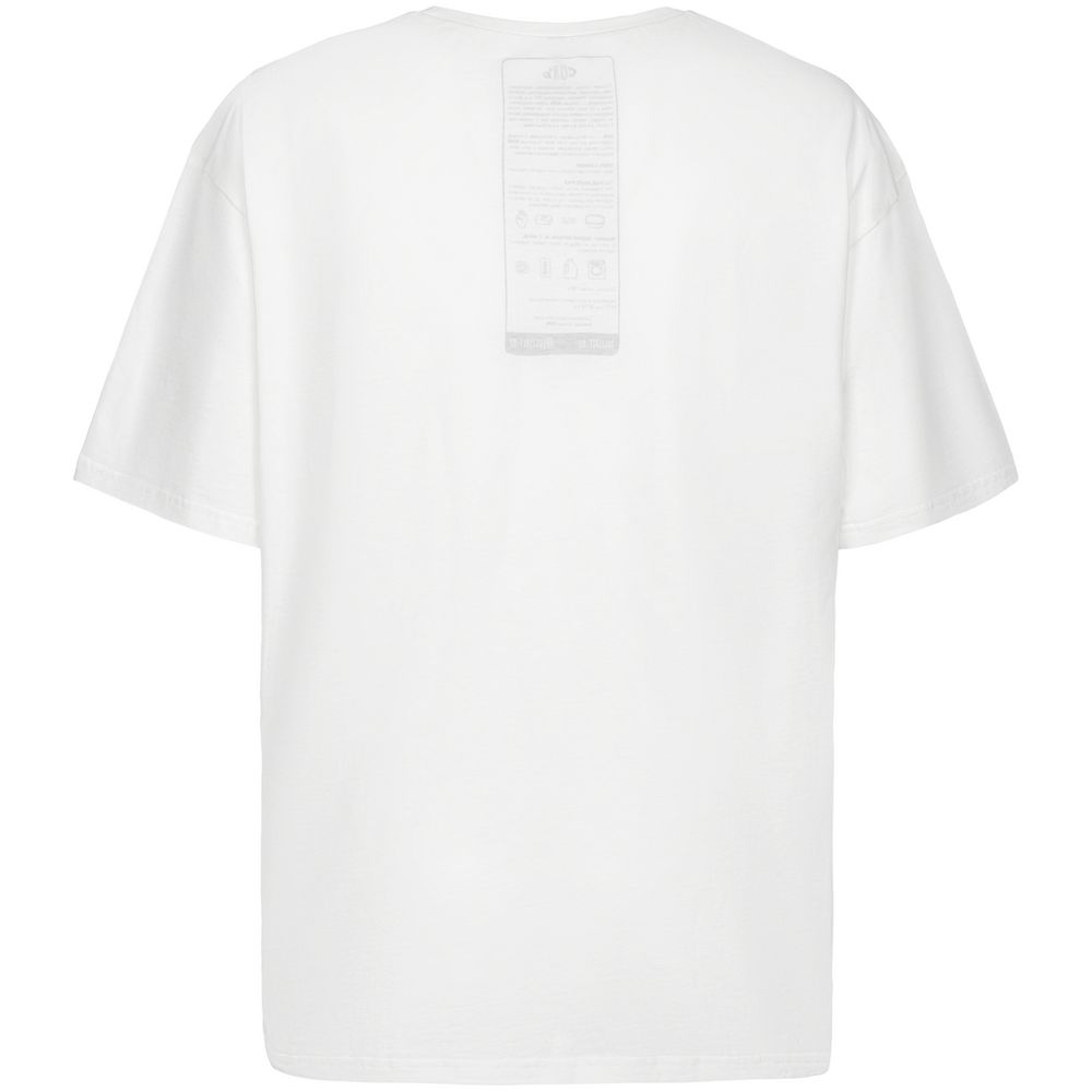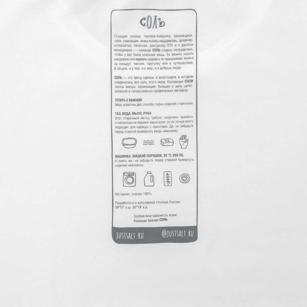 На изнаночной стороне футболки напечатан принт с информацией о бренде и инструкцией по уходу за изделием.