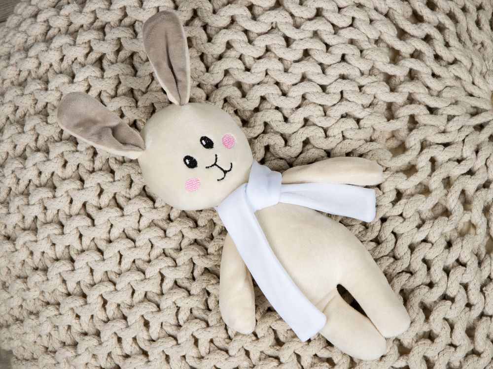 Зайчик-стесняшка из мягкого плюша с трогательно торчащими ушами влюбляет с первого взгляда и визуально, и тактильно. Шарфик снимается — так на него легко нанести пожелание или логотип компании.