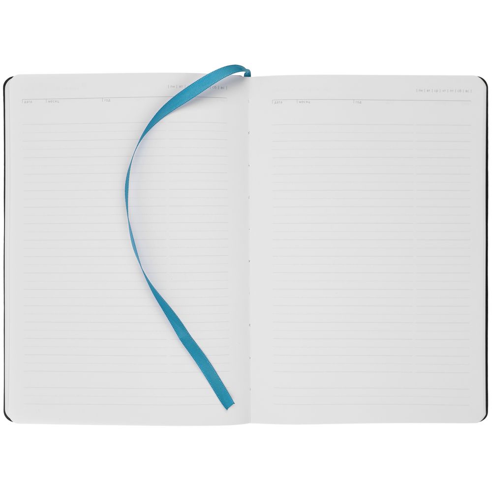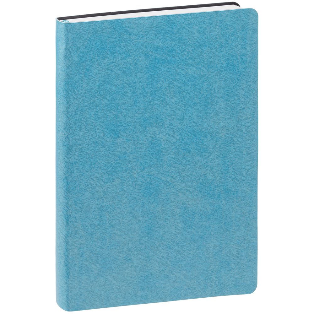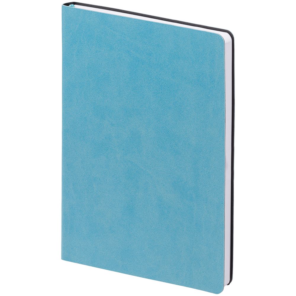 Ежедневник с гибкой обложкой, выполнен из материала Latte, голубой, дополнен ляссе в цвет обложки.