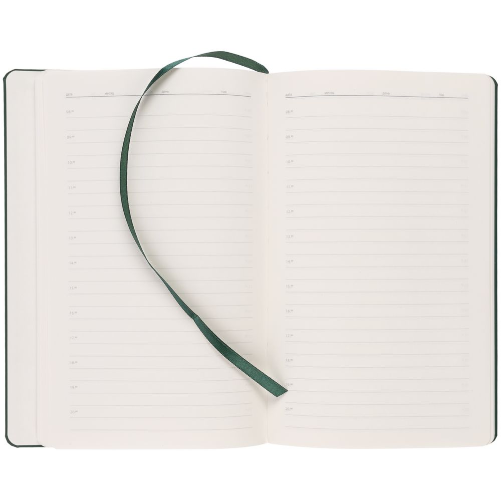 Ежедневник в твердой обложке, выполненной из материала Soft Touch, зеленый FF, дополнен цветным ляссе и магнитом, удерживающим ручку.