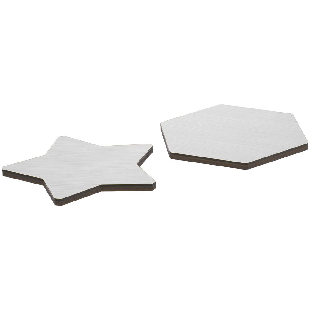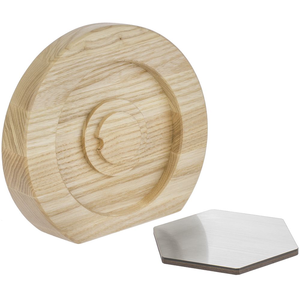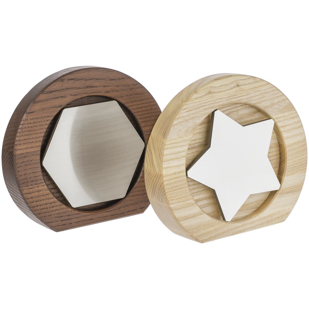 Красивое решение подойдет как для команды, так и для отдельных выдающихся личностей. Вставка с шестигранником из зеркального пластика на деревянной основе крепится на приподнятое основание внутри стелы, что создает объем и многослойность награды. На вставке предусмотрен клеевой слой для крепления после нанесения.