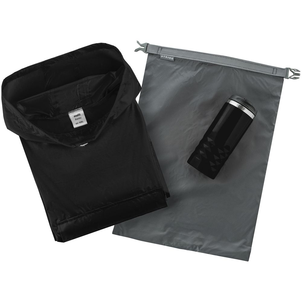 мешок - нейлон, рипстоп; термостакан - пластик, нержавеющая сталь; дождевик - полиэстер