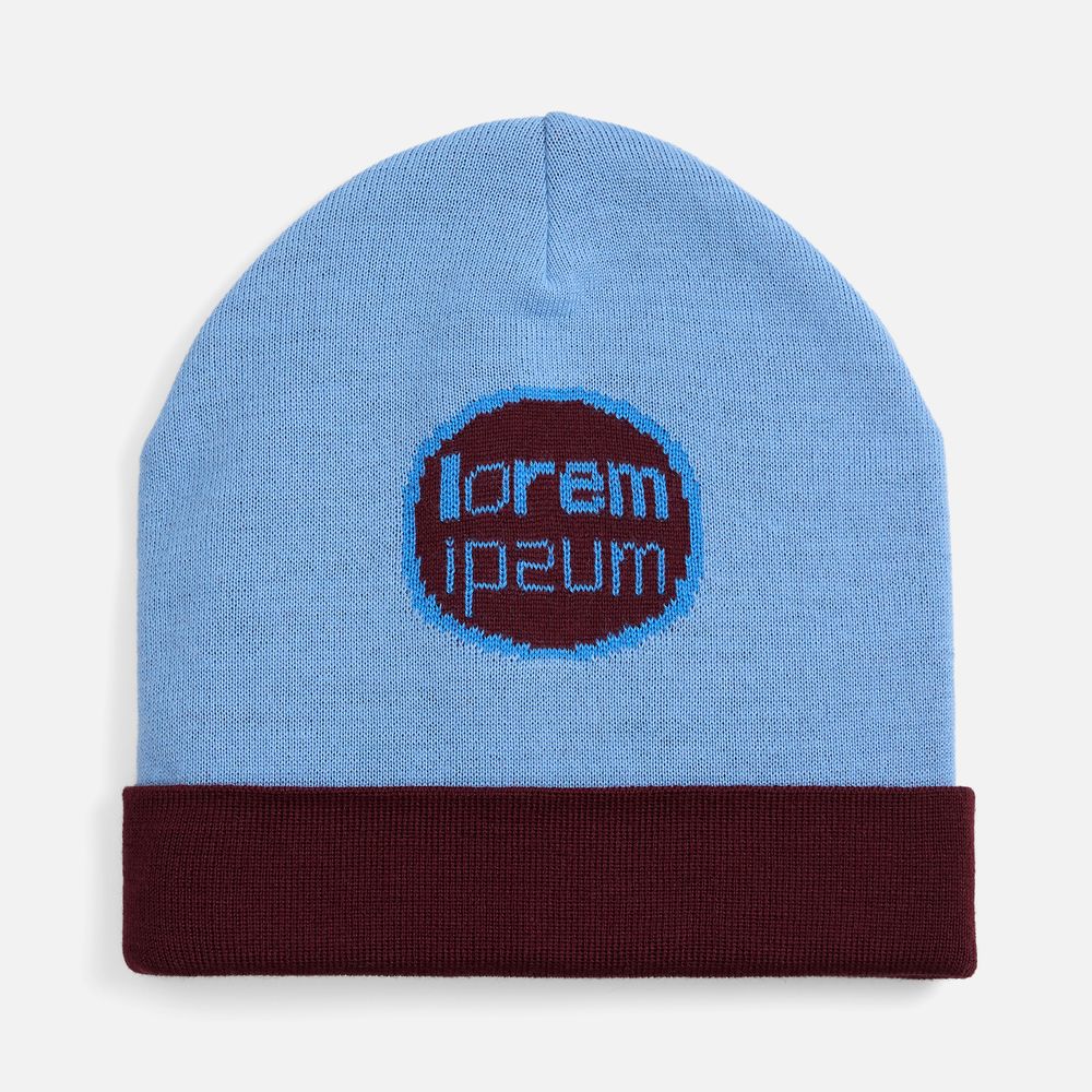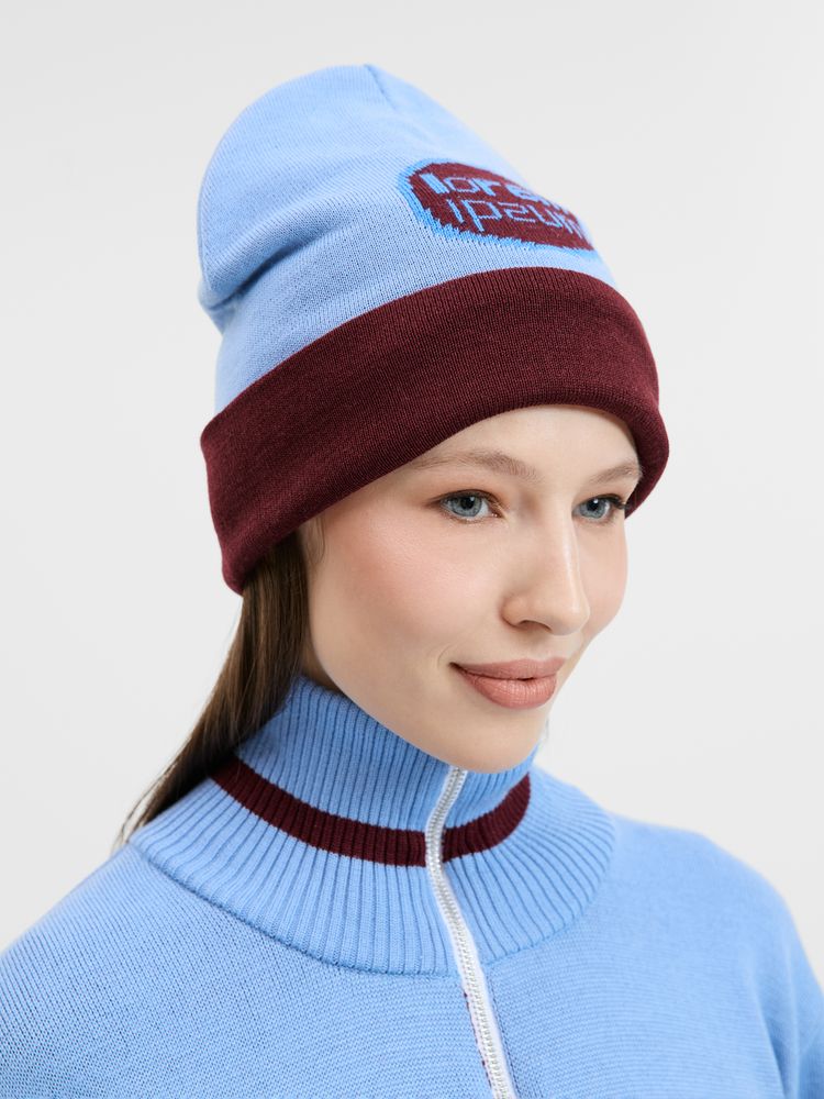 Шапка с вывязанным логотипом и индивидуальным рисунком в фирменной цветовой гамме.