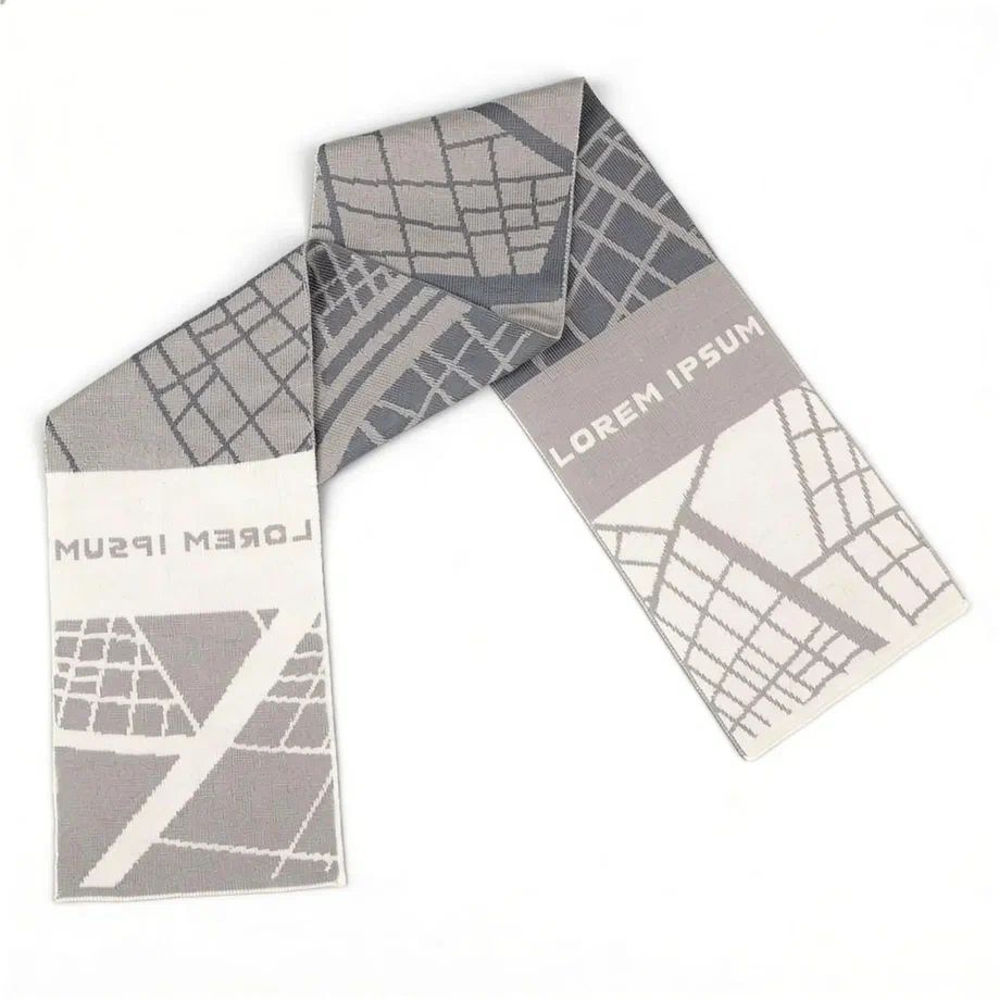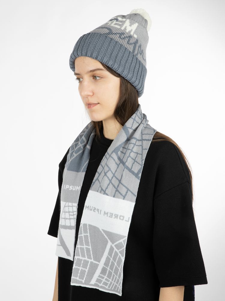 Шарф с вывязанным логотипом и индивидуальным рисунком в фирменной цветовой гамме.