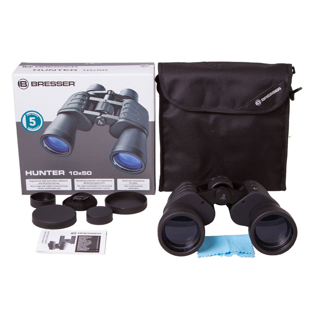 Бинокль создан на базе классической системы призм Порро, сделанных из стекла BK-7 с многослойным просветлением. Увеличение — 10x, диаметр объективов — 50 мм. Минимальное фокусное расстояние — 5 м. Бинокль имеет функцию подстройки межзрачкового расстояния и диоптрийной коррекции окуляров. Встроенная система центральной фокусировки позволит быстро настроить резкость.В комплект входит чехол из полиэстера.