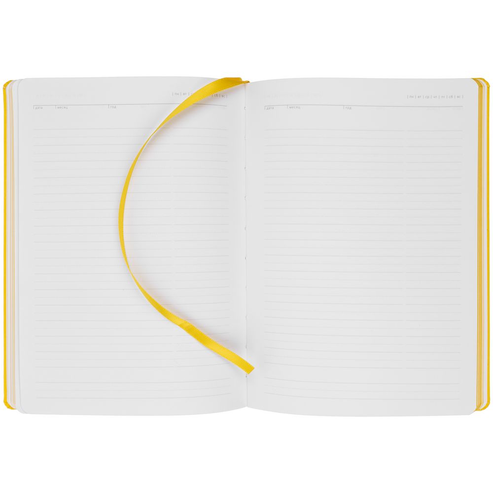 Ежедневник с твердой обложкой. Выполнен из материала Latte, желтый, дополнен ляссе в цвет обложки.
