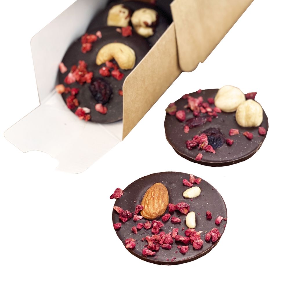 Шоколадные конфеты Mendiants — это яркий праздничный комплимент и настоящее гастрономическое путешествие. В наборе 12 медиантов из темного шоколада с посыпкой из сублимированных ягод и орехов. Вес 160 г. Срок годности 7 месяцев.