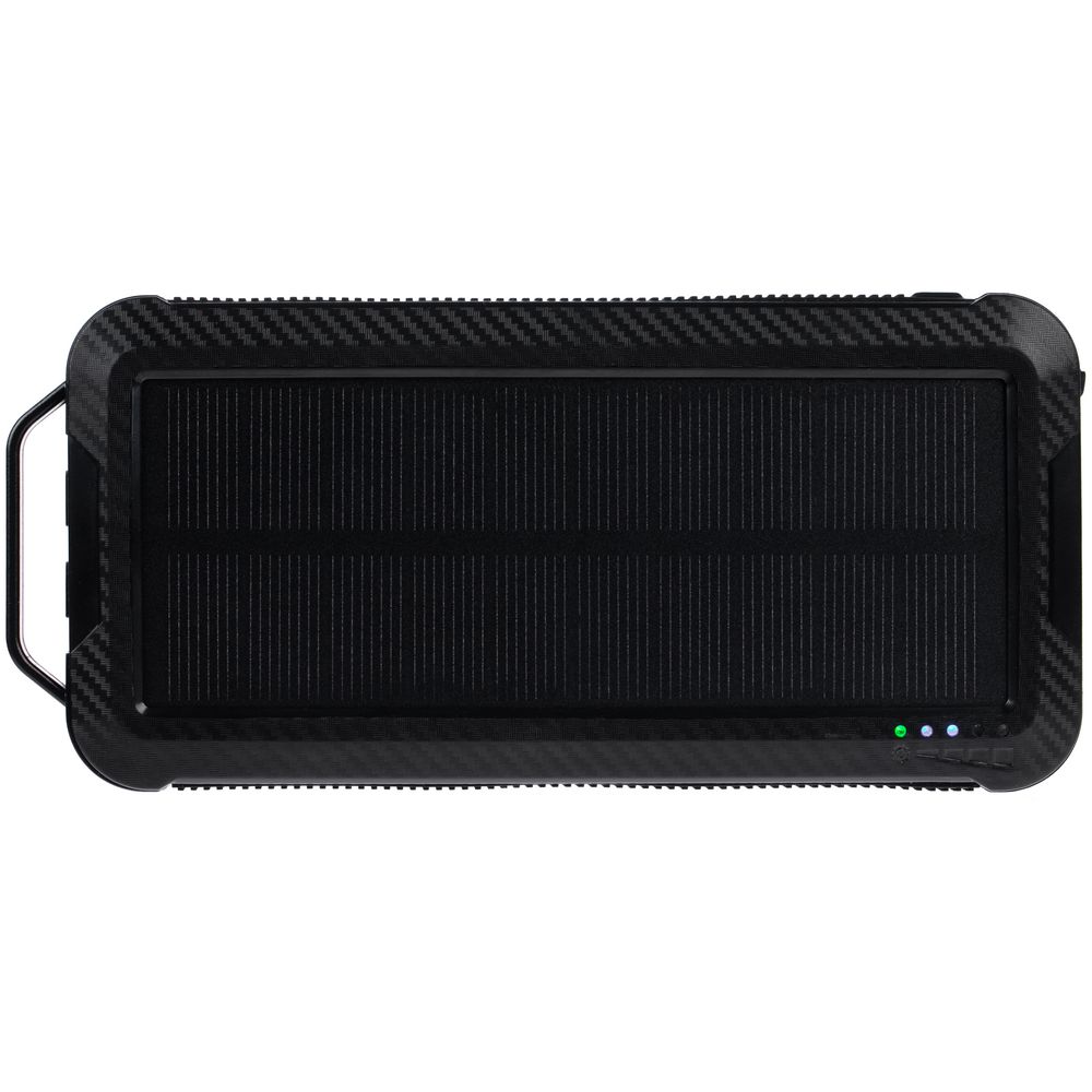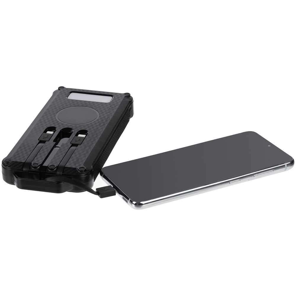 Прорезиненные вставки и рисунок на корпусе с имитацией карбона добавляют хорошей агрессивности внешнему виду аккумулятора — сразу видно, что его хозяин готов к приключениям.