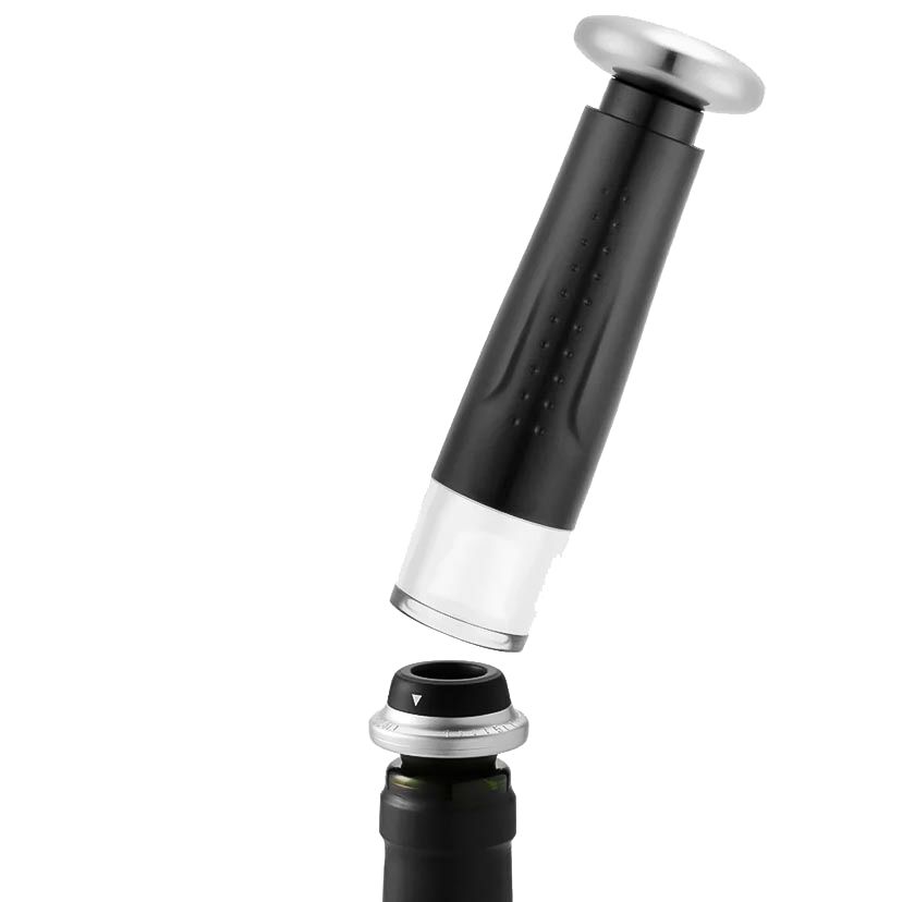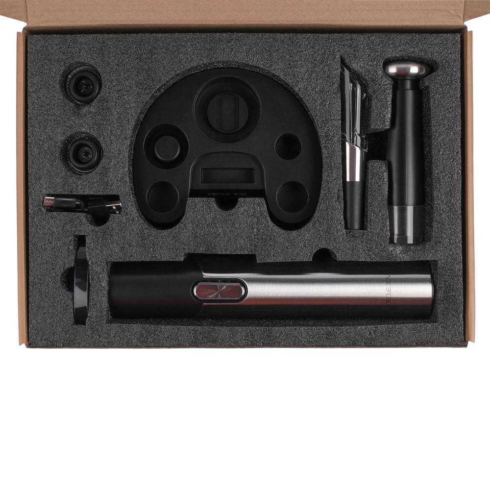 В комплекте электрический штопор для вина с открывашкой для пива, нож для фольги, пробка-аэратор, вакуумный насос с двумя силиконовыми пробками, подставка, инструкция