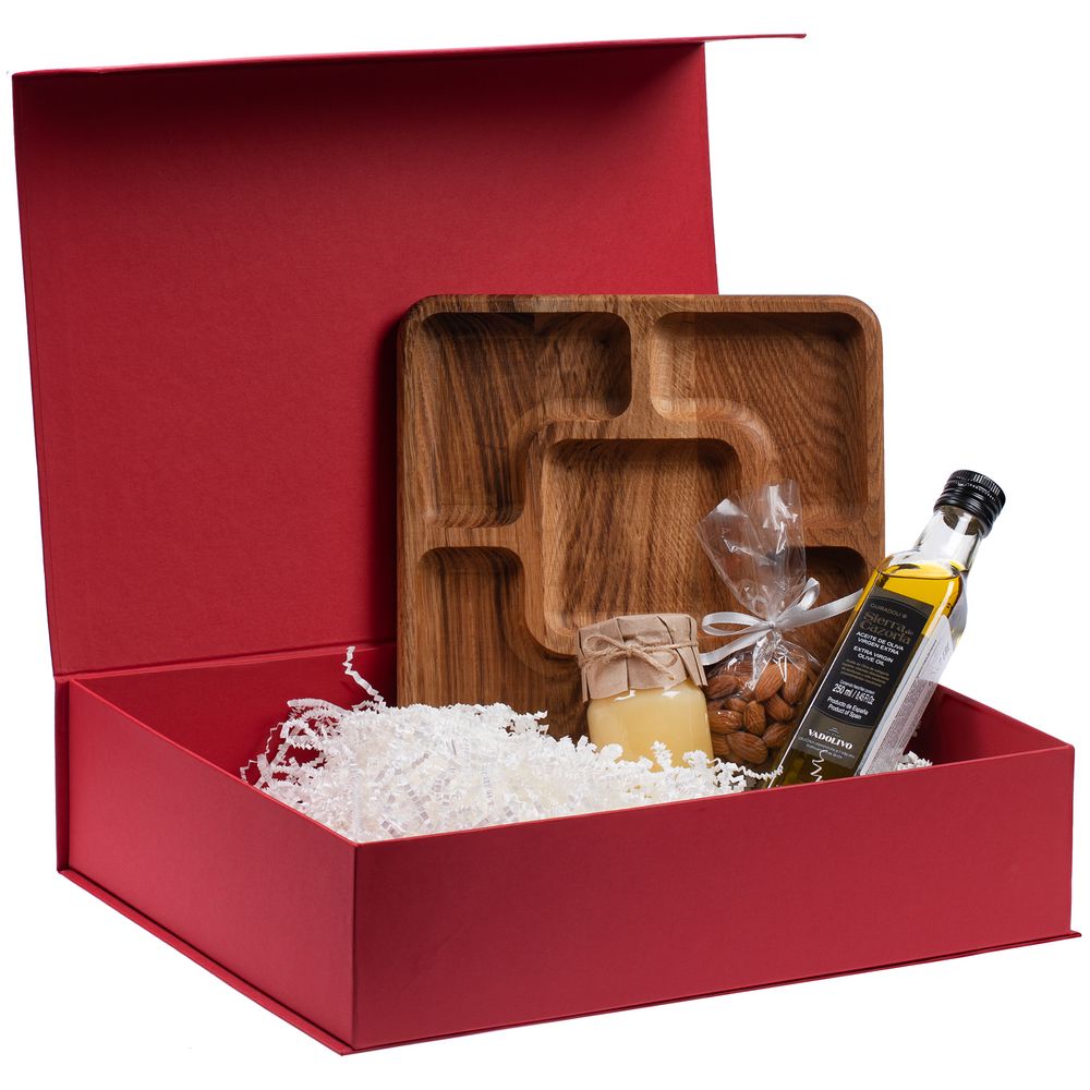 Коробка выполнена из переплетного картона, кашированного гладкой дизайнерской бумагой Magic, с крышкой на магнитах.