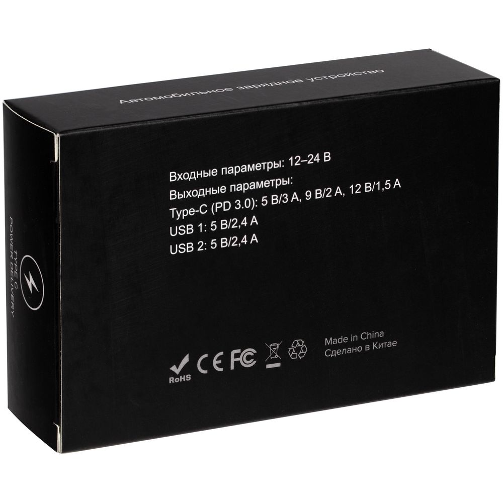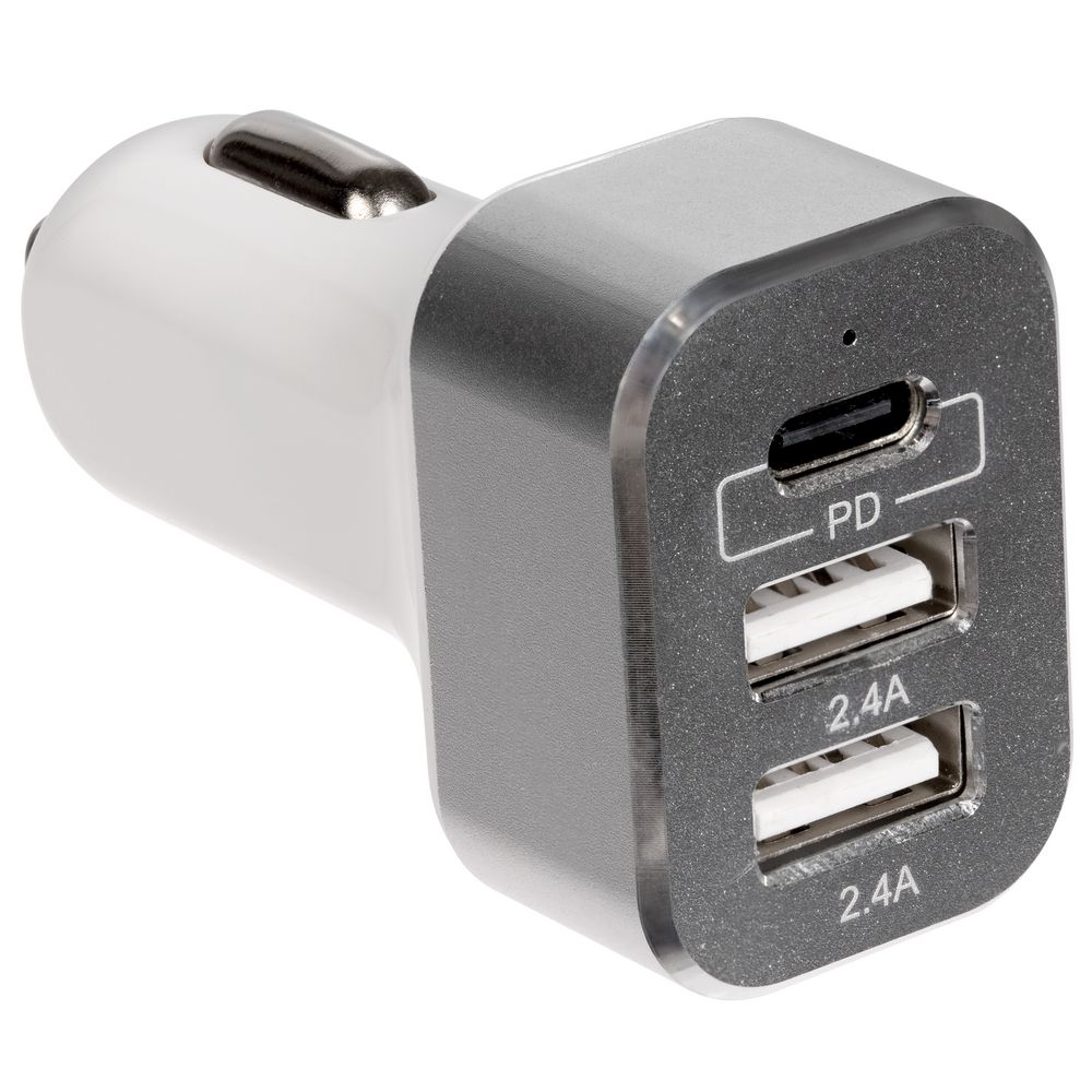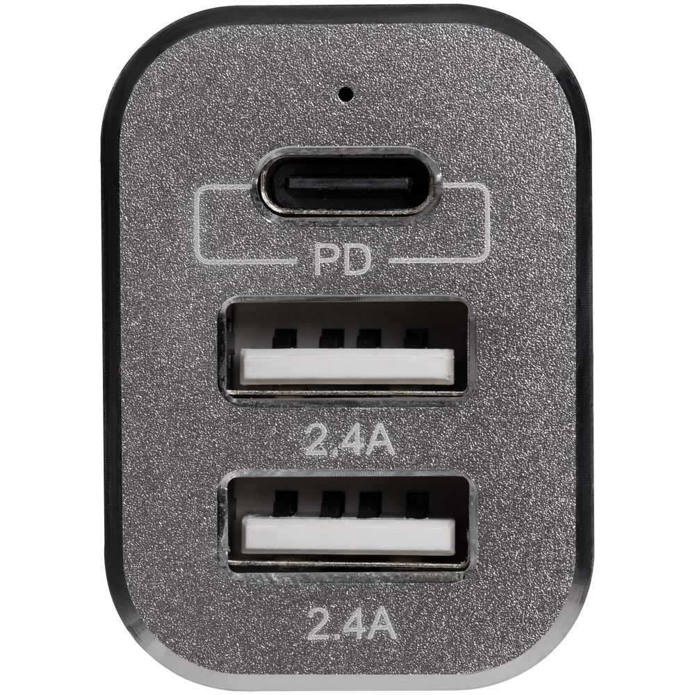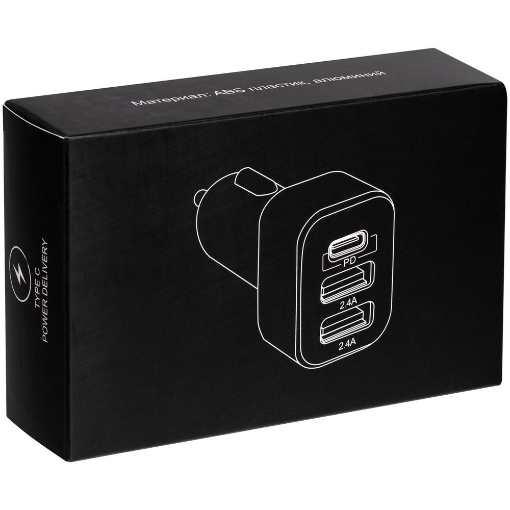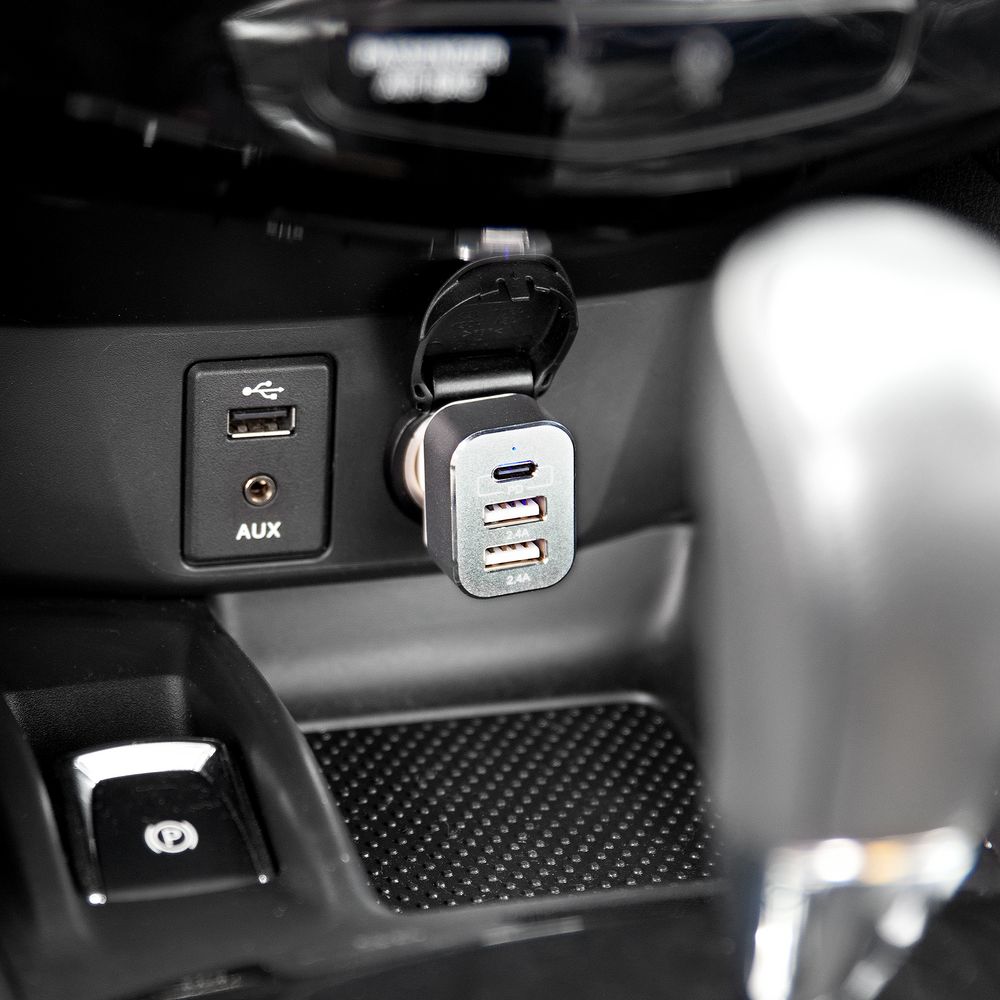 Компактное устройство-переходник с двумя портами USB и 1 портом Power Delivery Type-C подключается к прикуривателю автомобиля и используется для зарядки мелкой электроники.