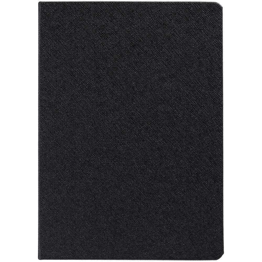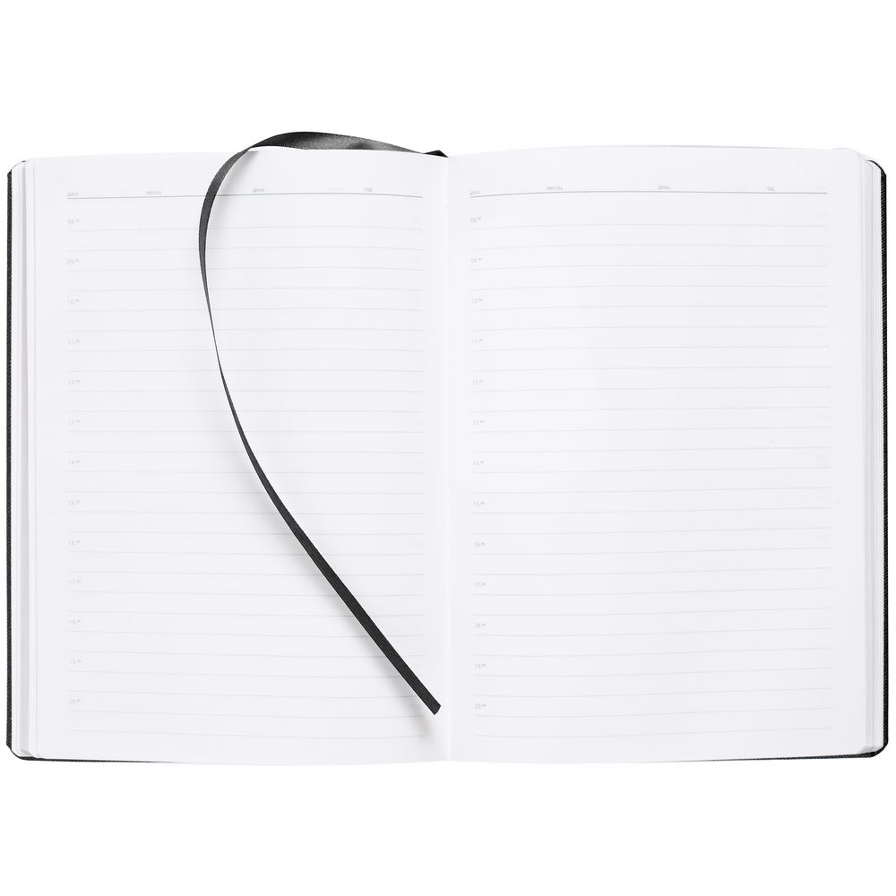Ежедневник с твердой обложкой и золотистым обрезом, выполнен из материала Saffian, черный АА, дополнен ляссе в цвет обложки.