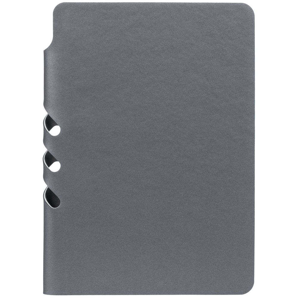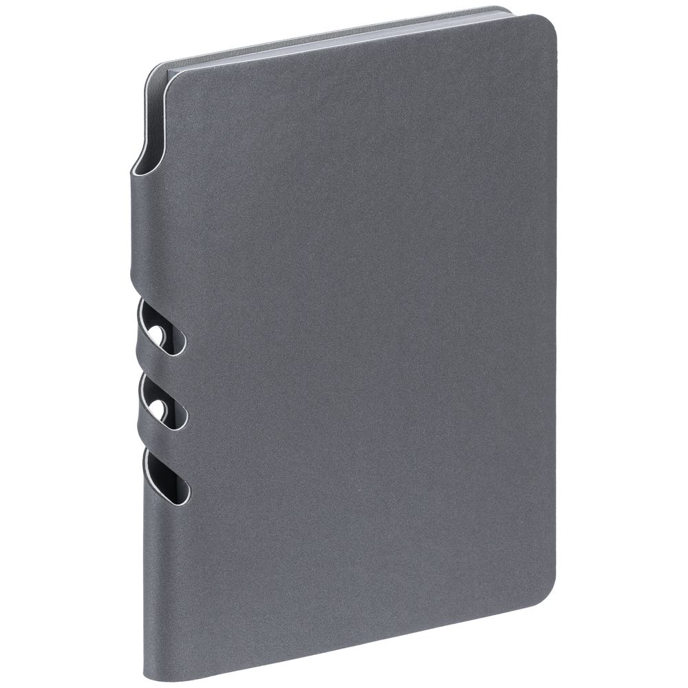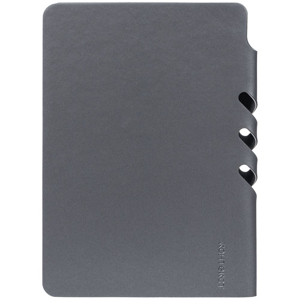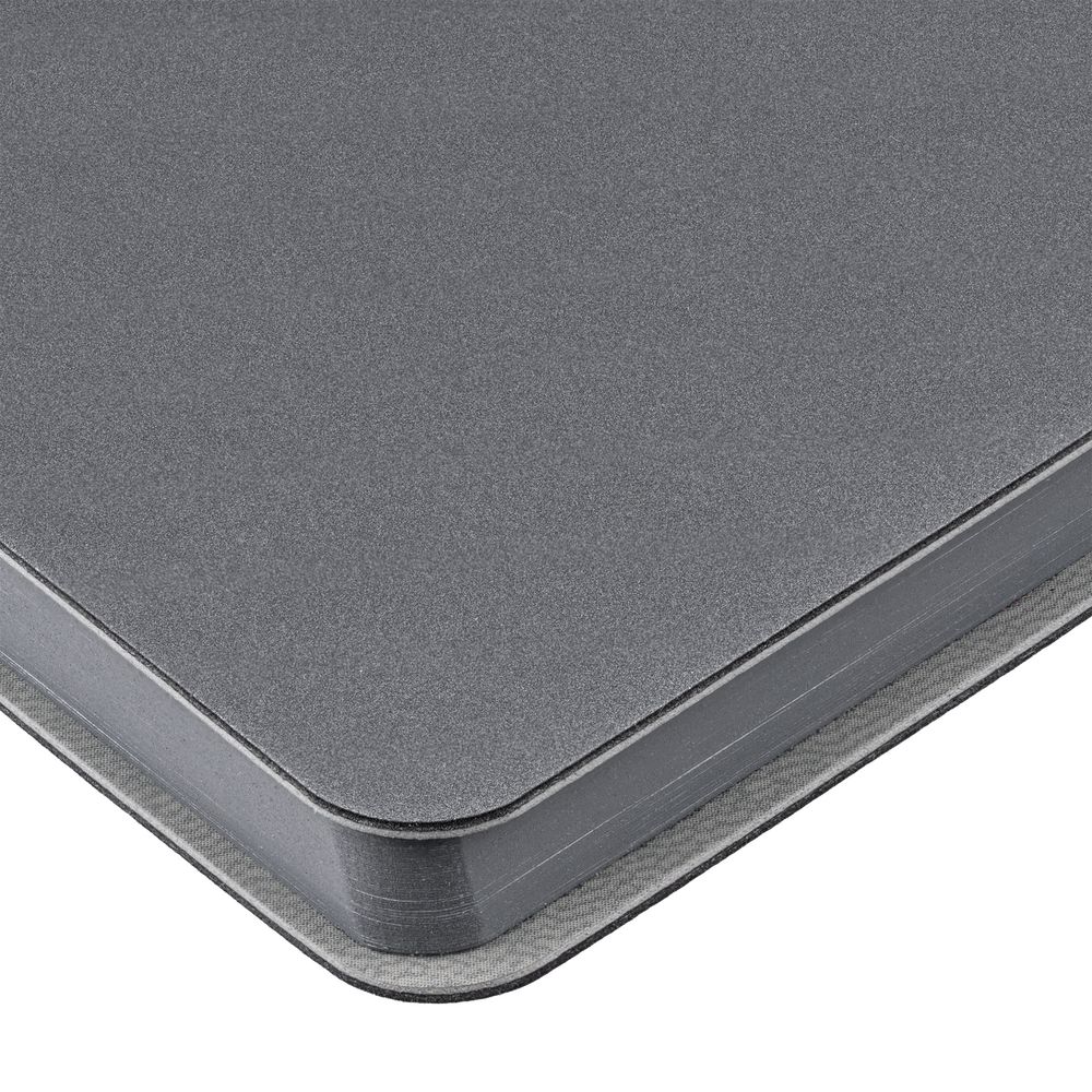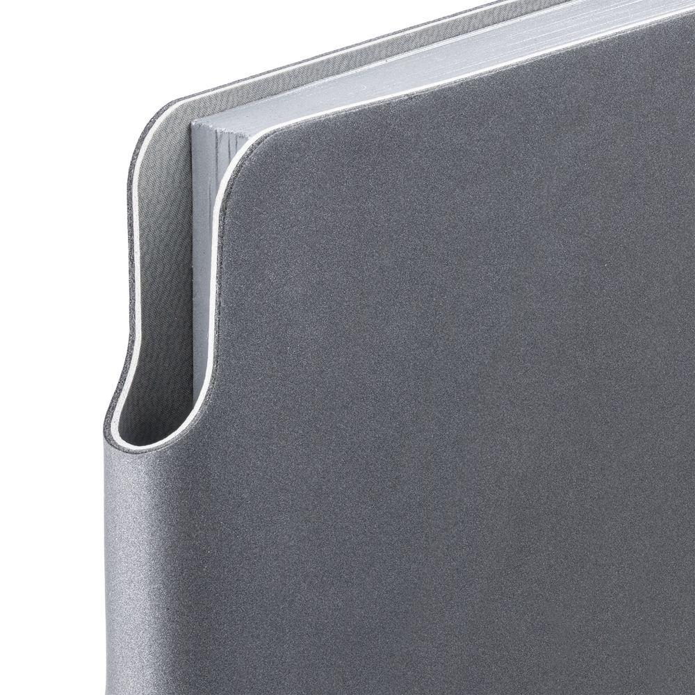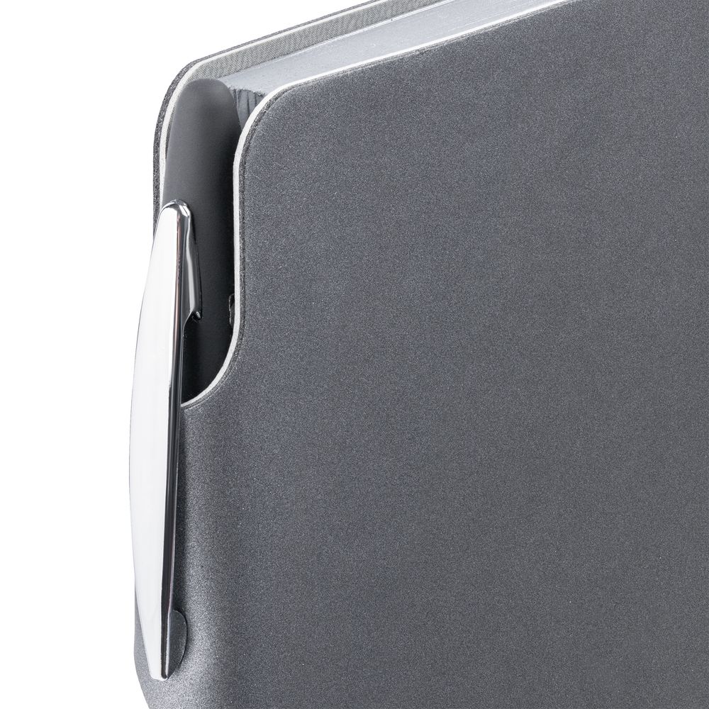 Ежедневник с гибкой обложкой выполнен из материала Soft Touch Pearl, серый СС и серого Latte (внутренняя часть обложки). Внутри корешка — специальное место для крепления ручки размером до 15х0,9 см.
