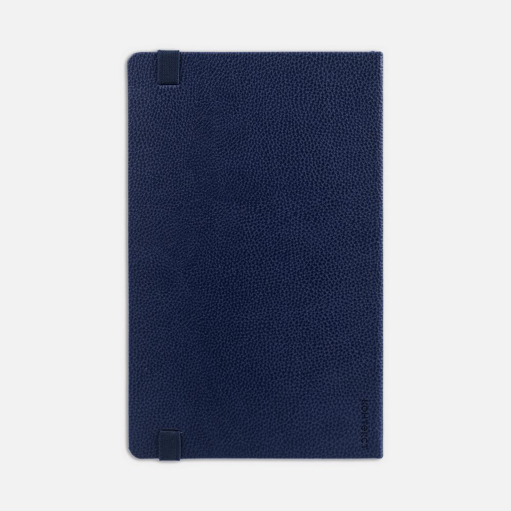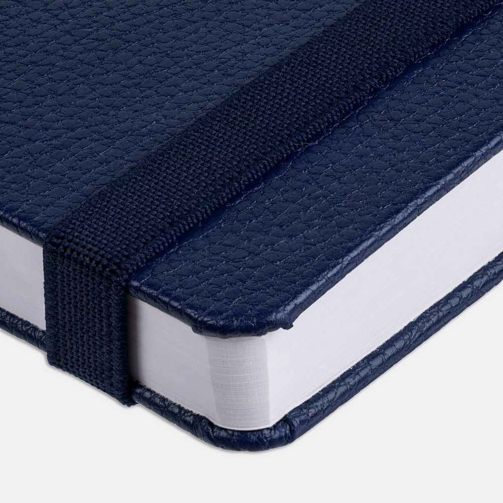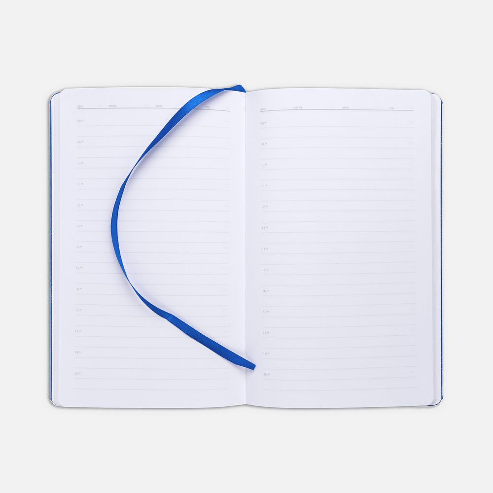 Ежедневник с твердой обложкой, выполнен из материала LaFite, темно-синий ХХ, дополнен резинкой с металлическим прямоугольным шильдом и ляссе в цвет обложки.