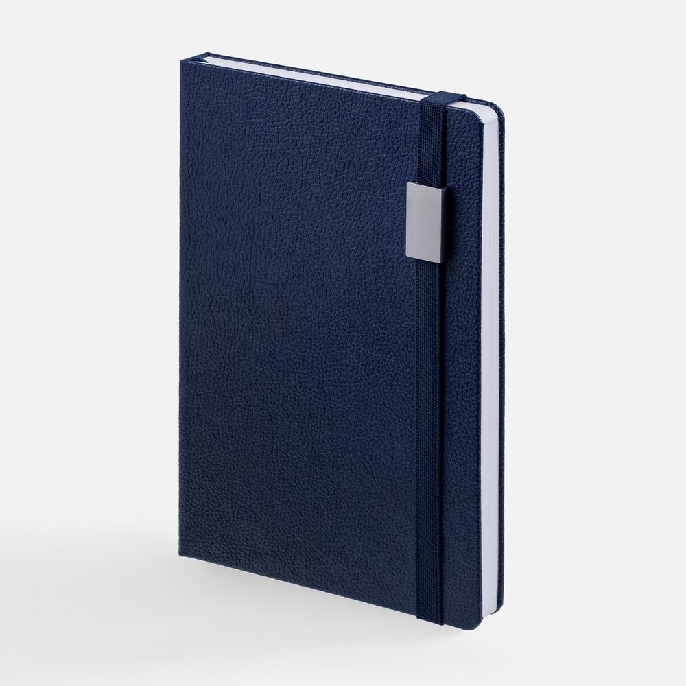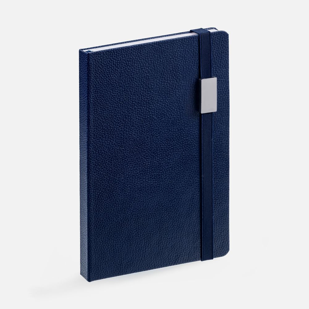 Зауженный ежедневник с прямоугольным металлическим шильдом на резинке.