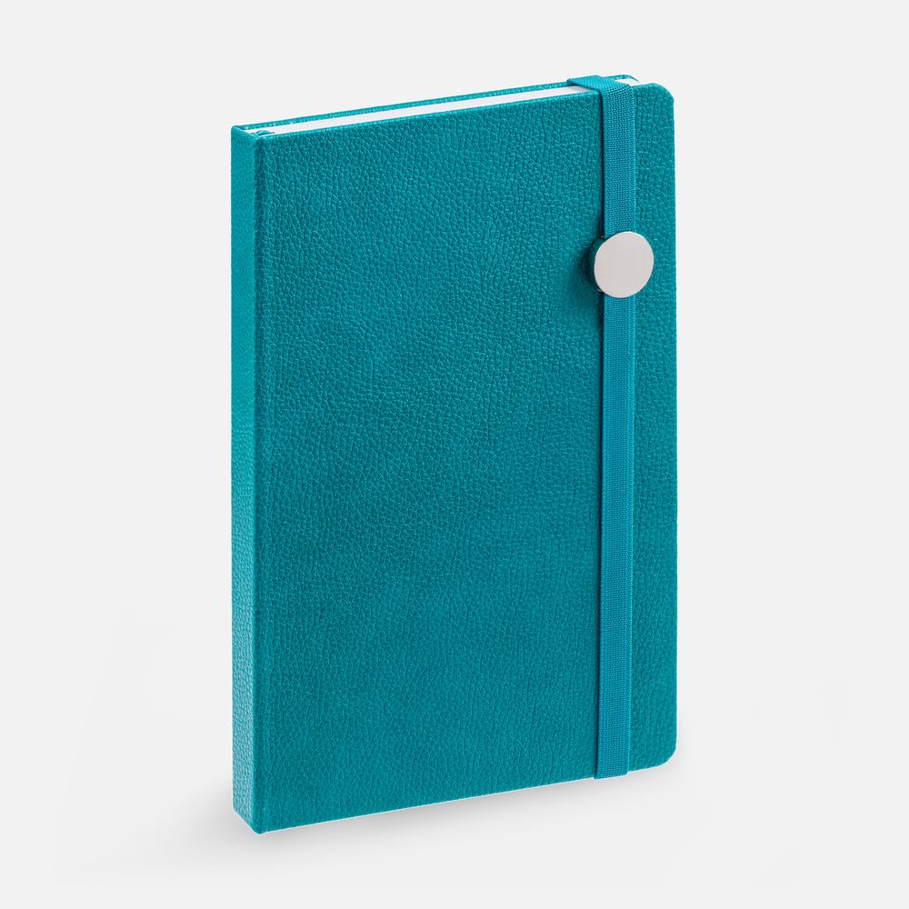 Зауженный ежедневник с круглым металлическим шильдом на резинке.