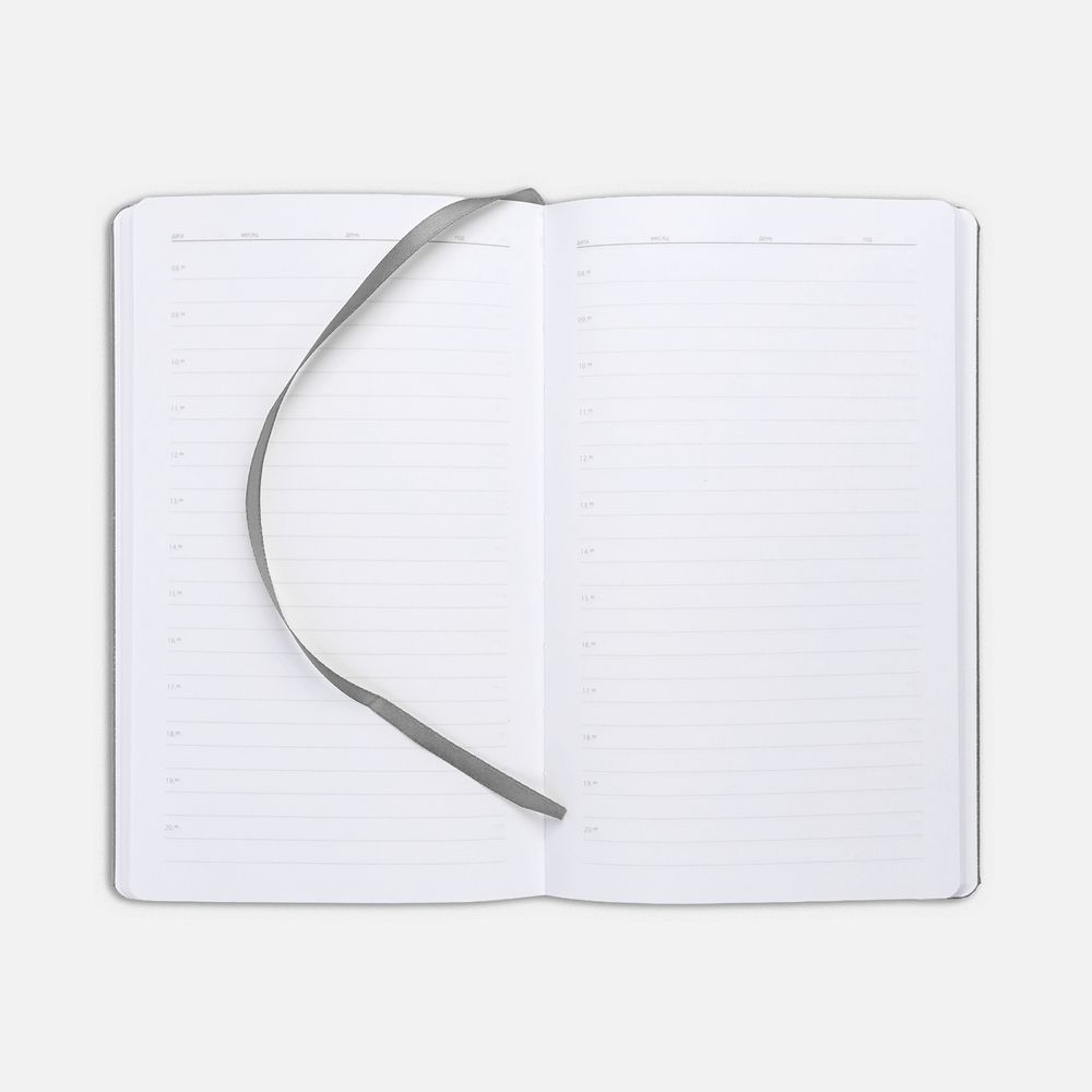 Ежедневник с твердой обложкой, выполнен из материала LaFite, серый СС, дополнен резинкой с металлическим круглым шильдом и ляссе в цвет обложки.