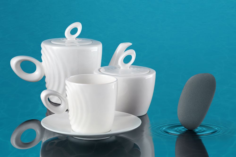 Чайная посуда Attimo дарит возможность прикоснуться к прекрасному не выходя из-за стола. Форма сервиза создана в скульптурной технике: фарфор словно запечатлел сам момент движения. Необычная ручка предметов символизирует камень, от которого появляются завораживающие круги на воде — корпусе изделия. Посуда выполнена из костяного фарфора, что делает ее необычайно легкой и прочной одновременно.При этом благодаря биоморфическим формам кажется, что твердый материал становится мягким и податливым.