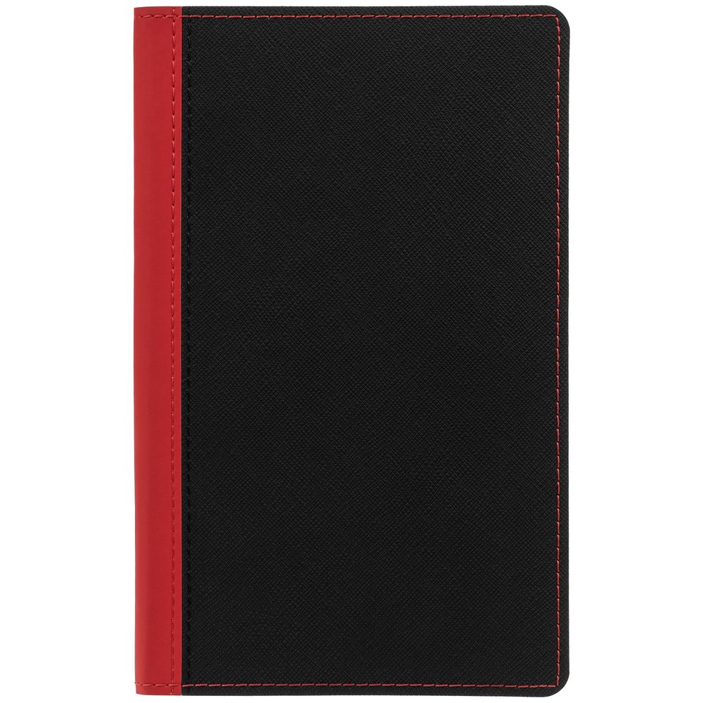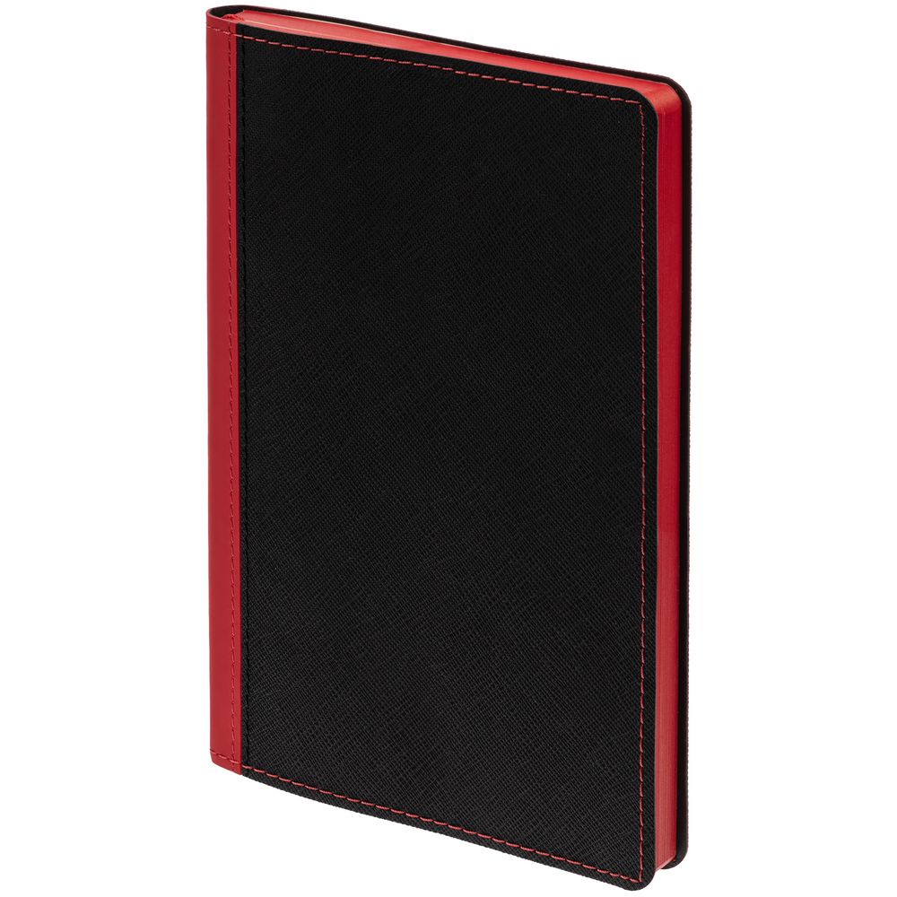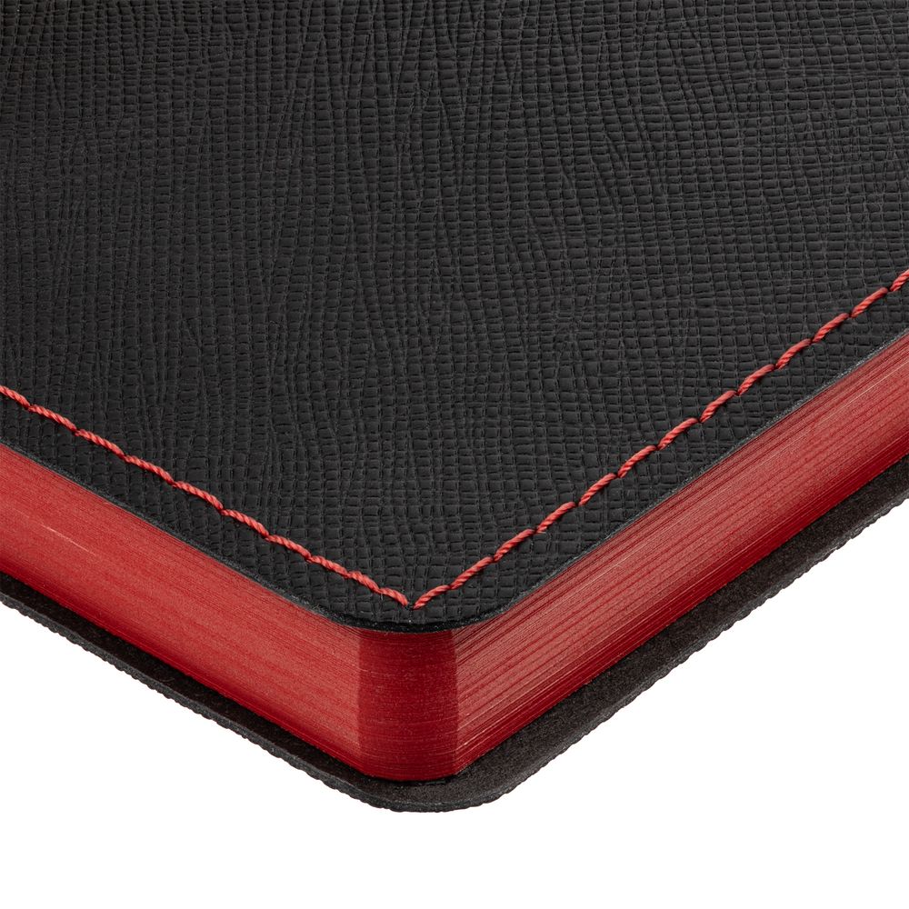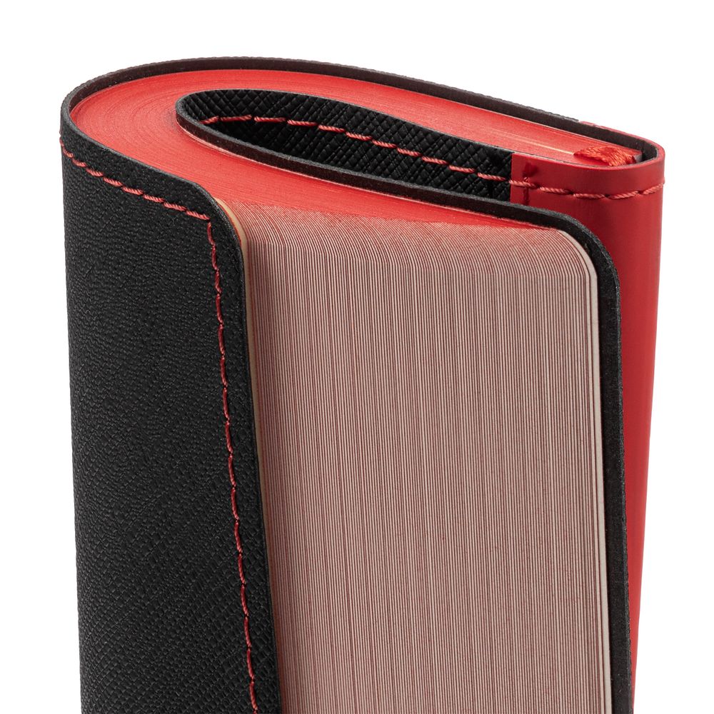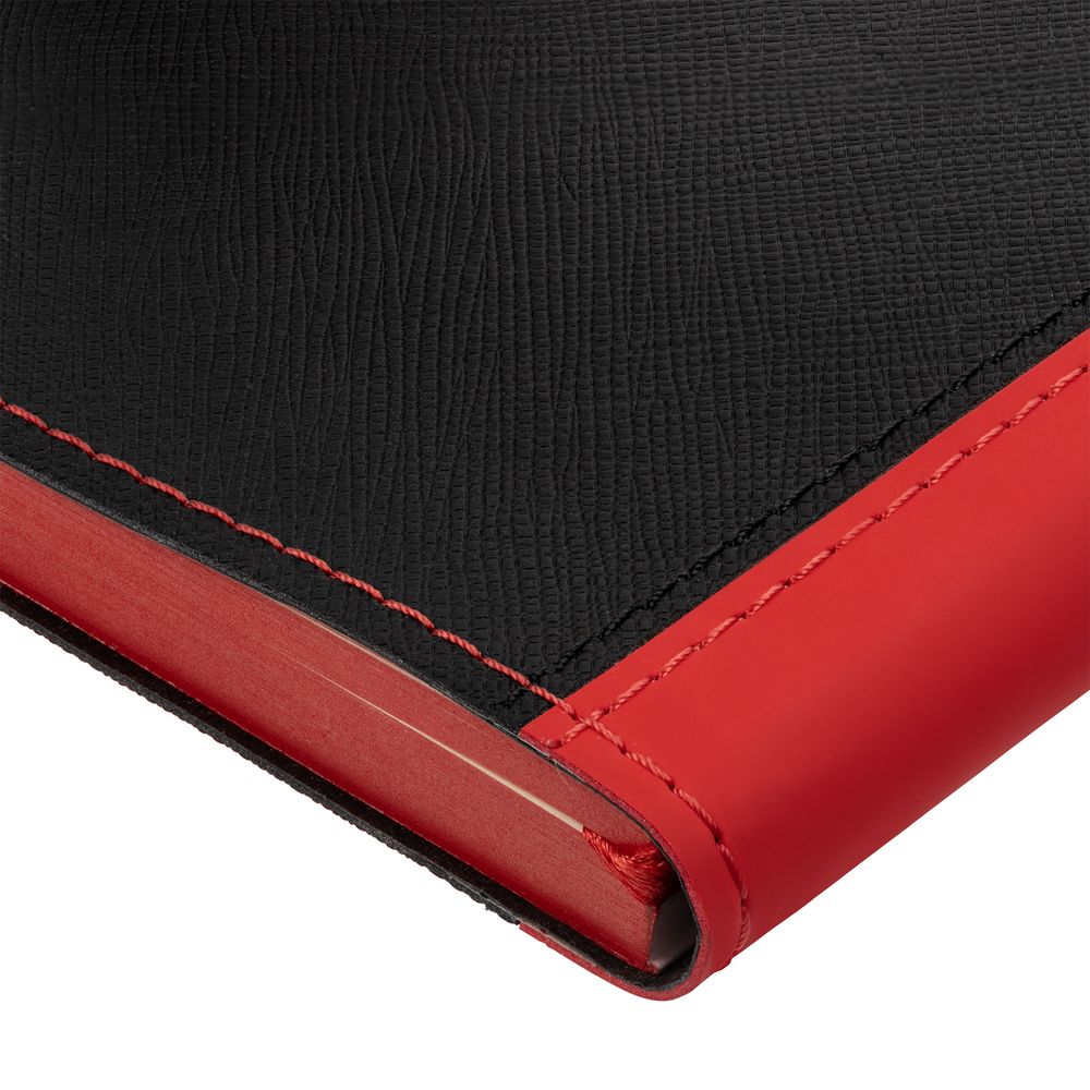 Ежедневник с гибкой обложкой выполнен из материала Nice Touch, черный АА и Soft Touch Ultra, красный РР, дополнен ляссе красного цвета.