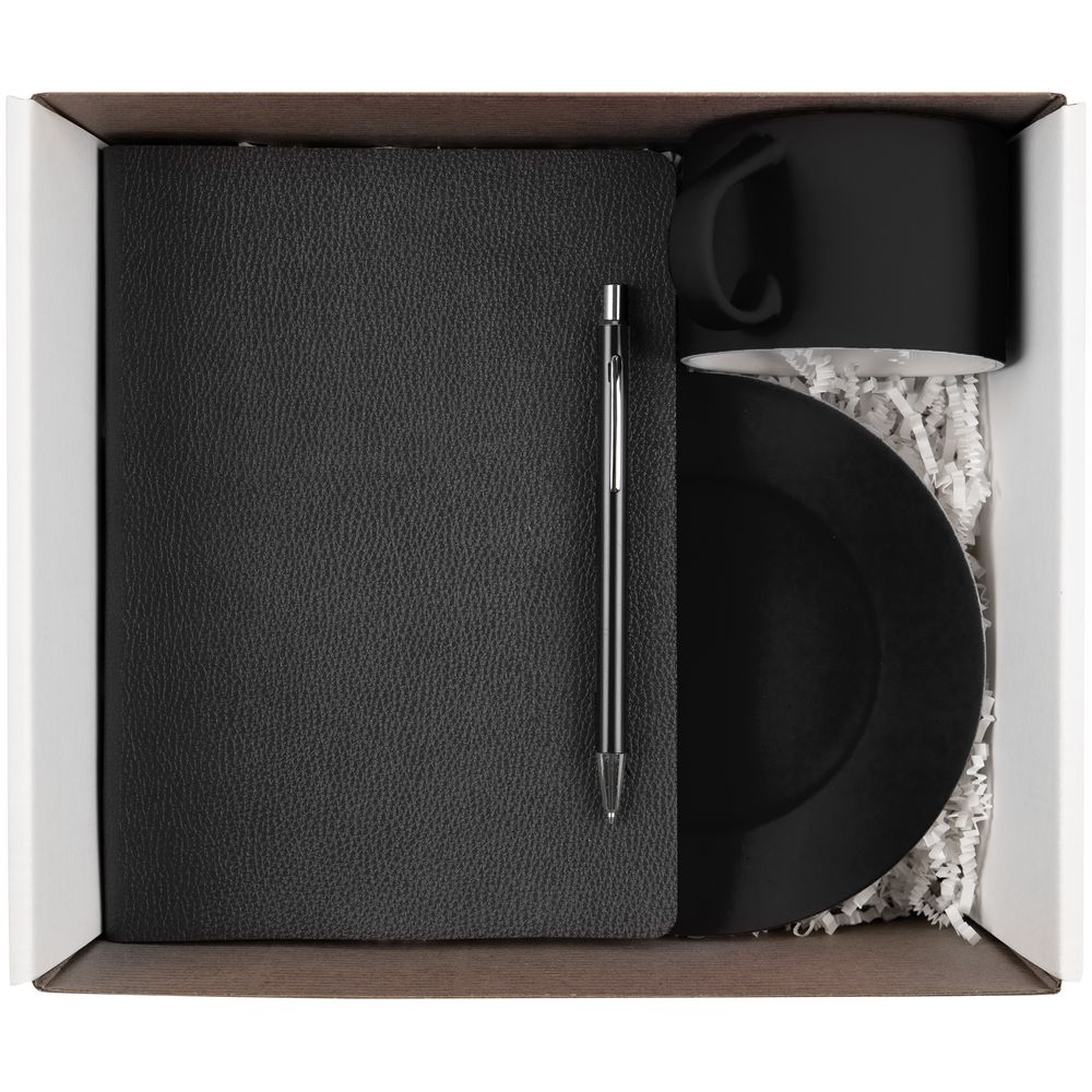 ежедневник - искусственная кожа; чайная пара - фарфор, покрытие соф-тач; ручка - металл; коробка - микрогофрокартон