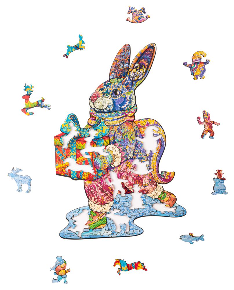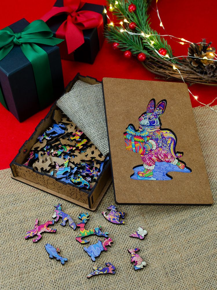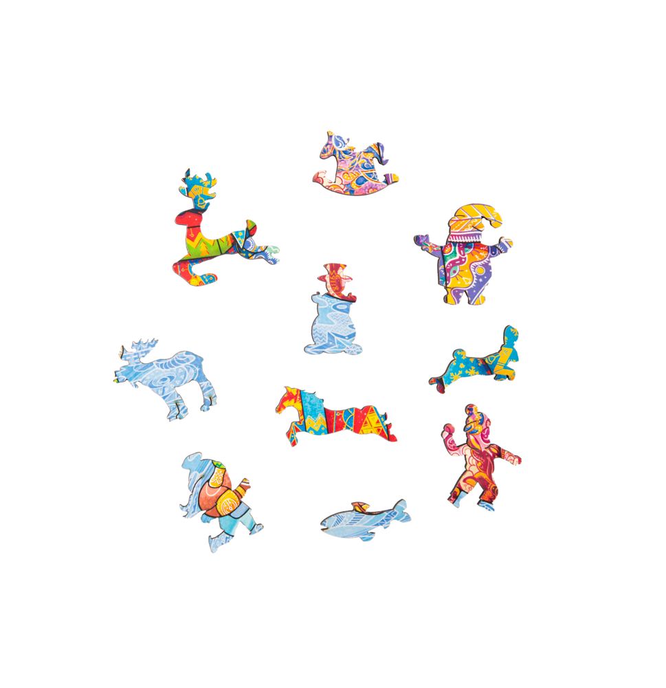 В Новый год нужно дарить настоящие сокровища! В этом сказочном сундучке прячется деревянный пазл из фигурных деталей с причудливыми узорами. Необычная форма деталей добавляет сложности и одновременно превращает процесс сборки в настоящее приключение. Вас ждут фигурки, связанные с зимними праздниками: вот мальчик бросает снежки, олени везут подарки, а Дед Мороз приветствует Новый год. Все вместе они складываются в яркий символ наступающего года, который непременно принесет удачу и счастье. Состоит из 100 деталей в виде различных фигурок. Упакован в деревянную подарочную коробку, которая послужит подсказкой с изображением во время сборки пазла, а затем легко станет частью праздничного интерьера.