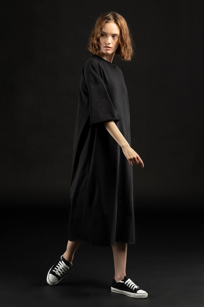 Всем, кто мечтает о собственной капсульной коллекции, но не знает, с чего начать. Платье свободного кроя со спущенным плечом.
