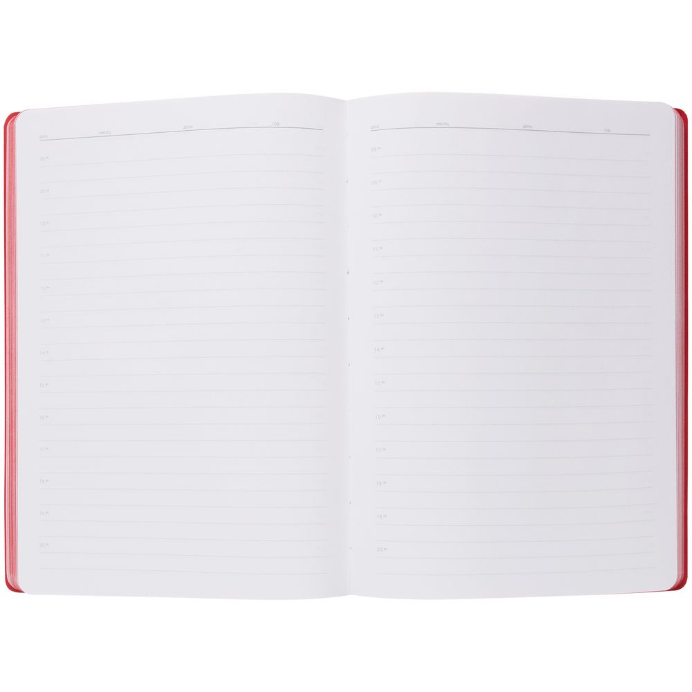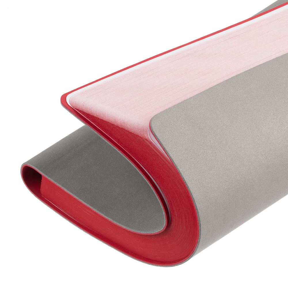 Гибкая обложка выполнена из материала Velour Melange, серый СС и Latte, красный PP (внутренняя часть обложки). Внутри корешка — специальное место для крепления ручки размером до 15х0,9 см.