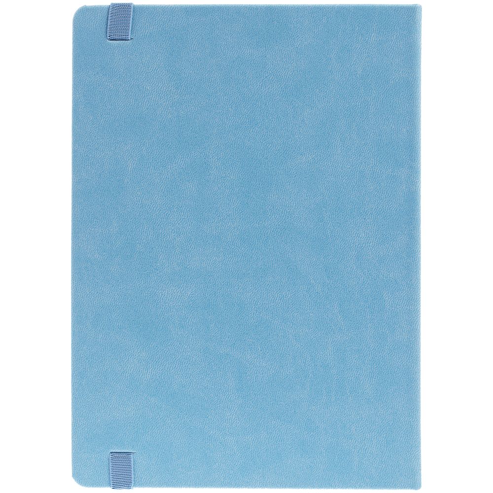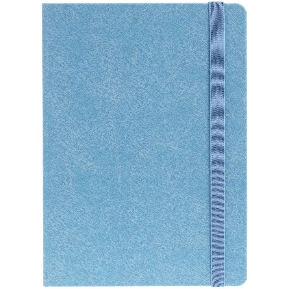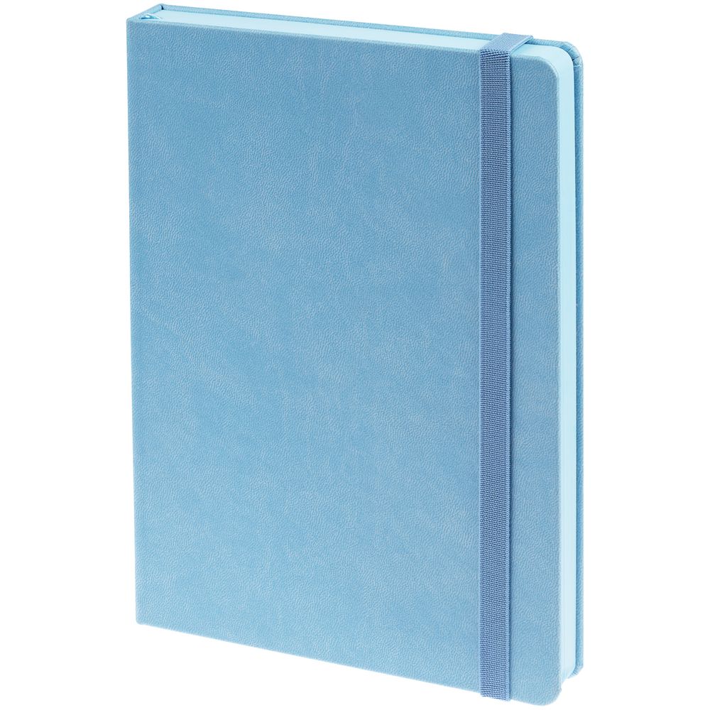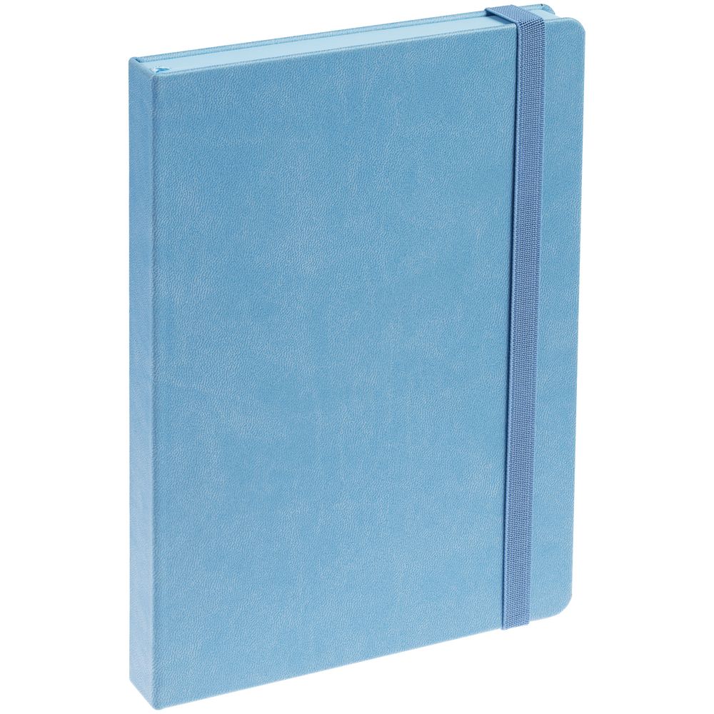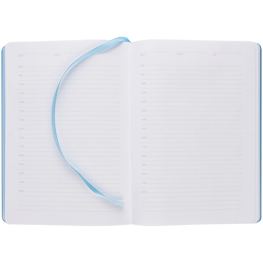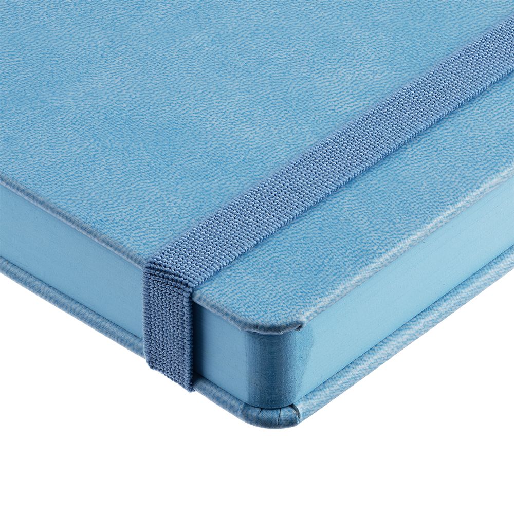 Ежедневник с твердой обложкой, выполнен из материала Latte, голубой JJ, обрез голубого цвета, дополнен резинкой и ляссе голубого цвета.