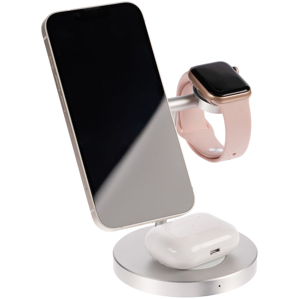 Выходная мощность беспроводного заряда при использовании зарядного устройства QC 2.0–3.0 (18–20 Вт) с параметрами зарядки не менее 5 В, 2 А; 9 B, 2,2 A (в комплект не входит): — основная магнитная область: 10 Вт — область для наушников на основании станции: 3 Вт — область для Apple Watch c поддержкой QI (Watch 2–8): 1 Вт