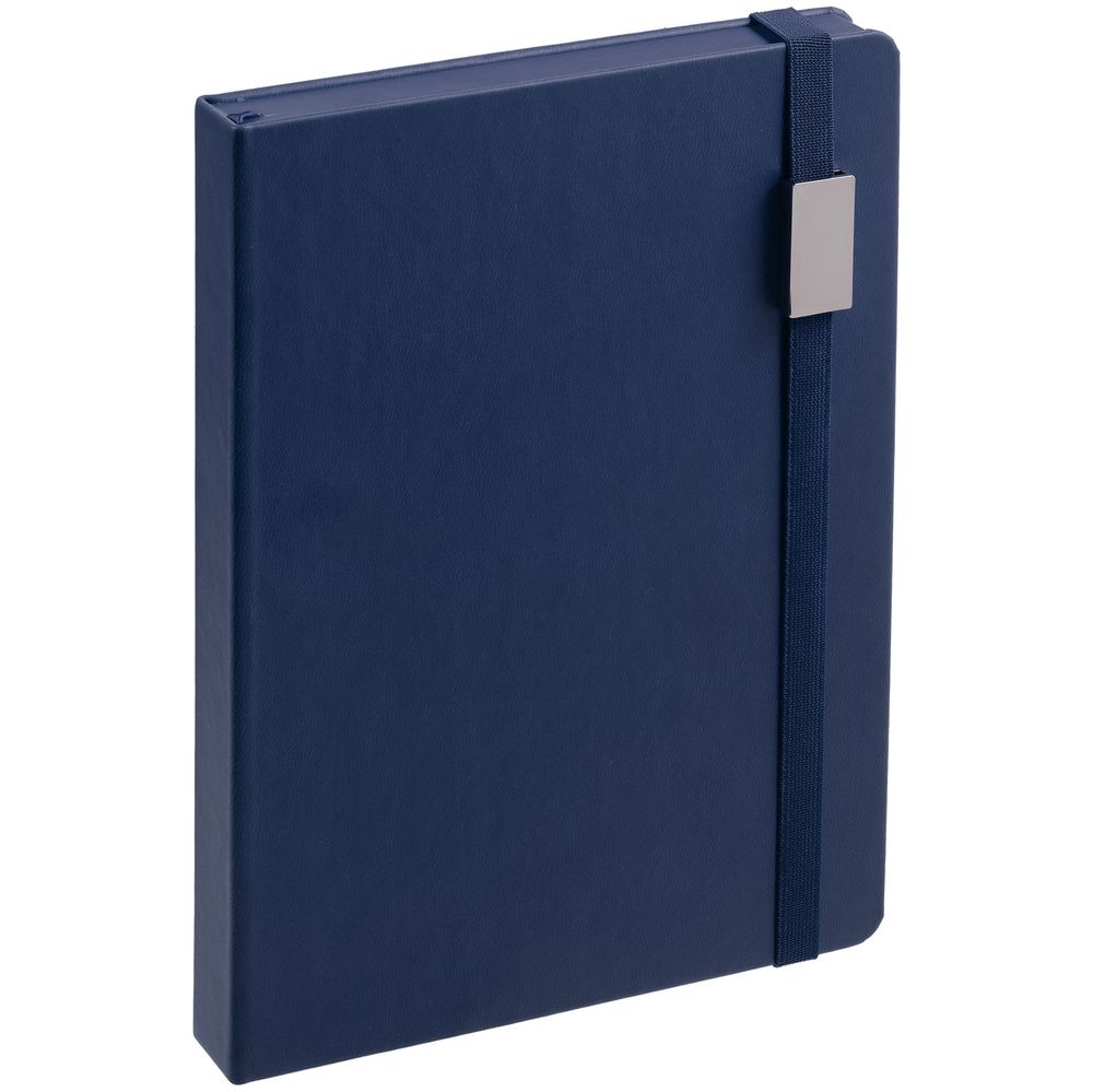 Ежедневник с твердой обложкой, выполнен из материала Latte, темно-синий ХХ, обрез темно-синего цвета, дополнен ляссе темно-синего цвета и резинкой с металлическим шильдом.