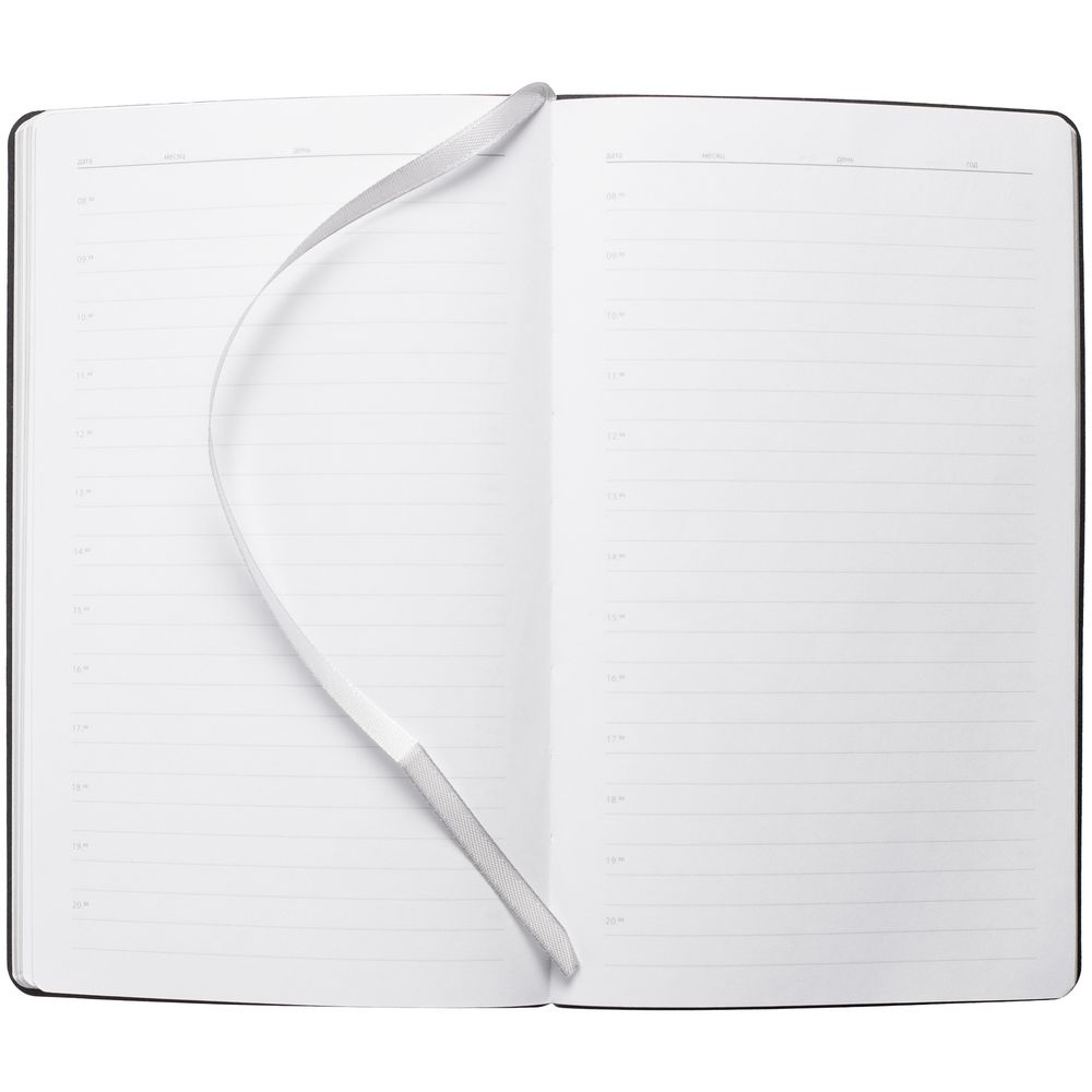 Ежедневник с гибкой обложкой и металлическим корешком, выполнен из материала Soft Touch, черный АА, дополнен серебристым обрезом блока и ляссе.